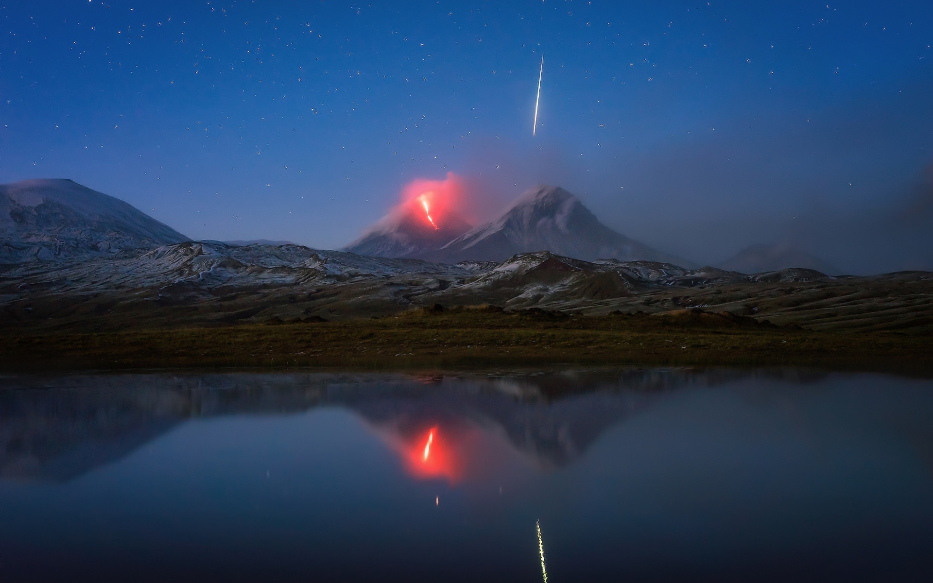 Description: A mountain with a reflection of a red light in the water and a shooting star in the sky above it.