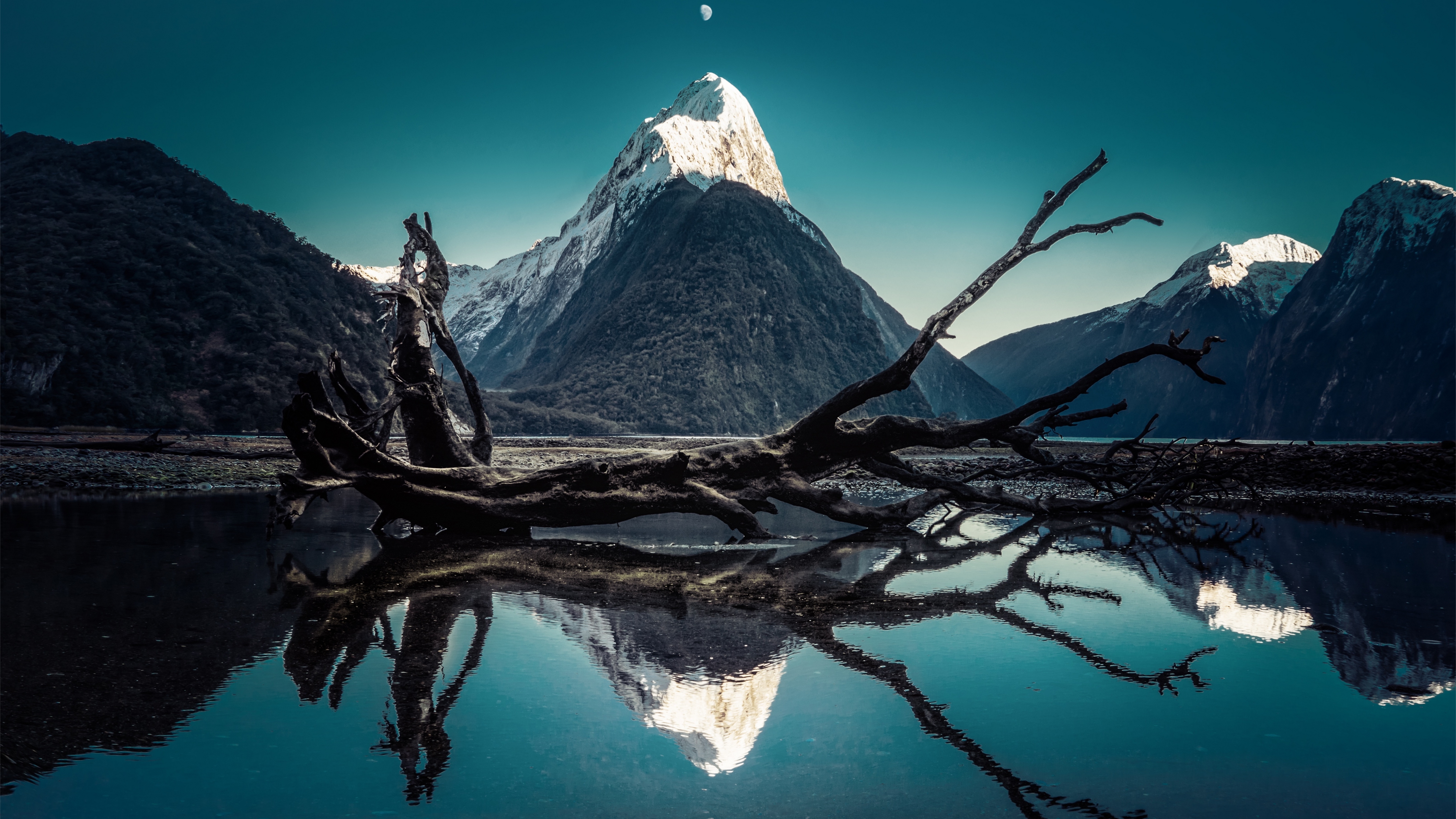 Description: A mountain is reflected in a still lake with a fallen tree in the foreground and a mountain in the background.