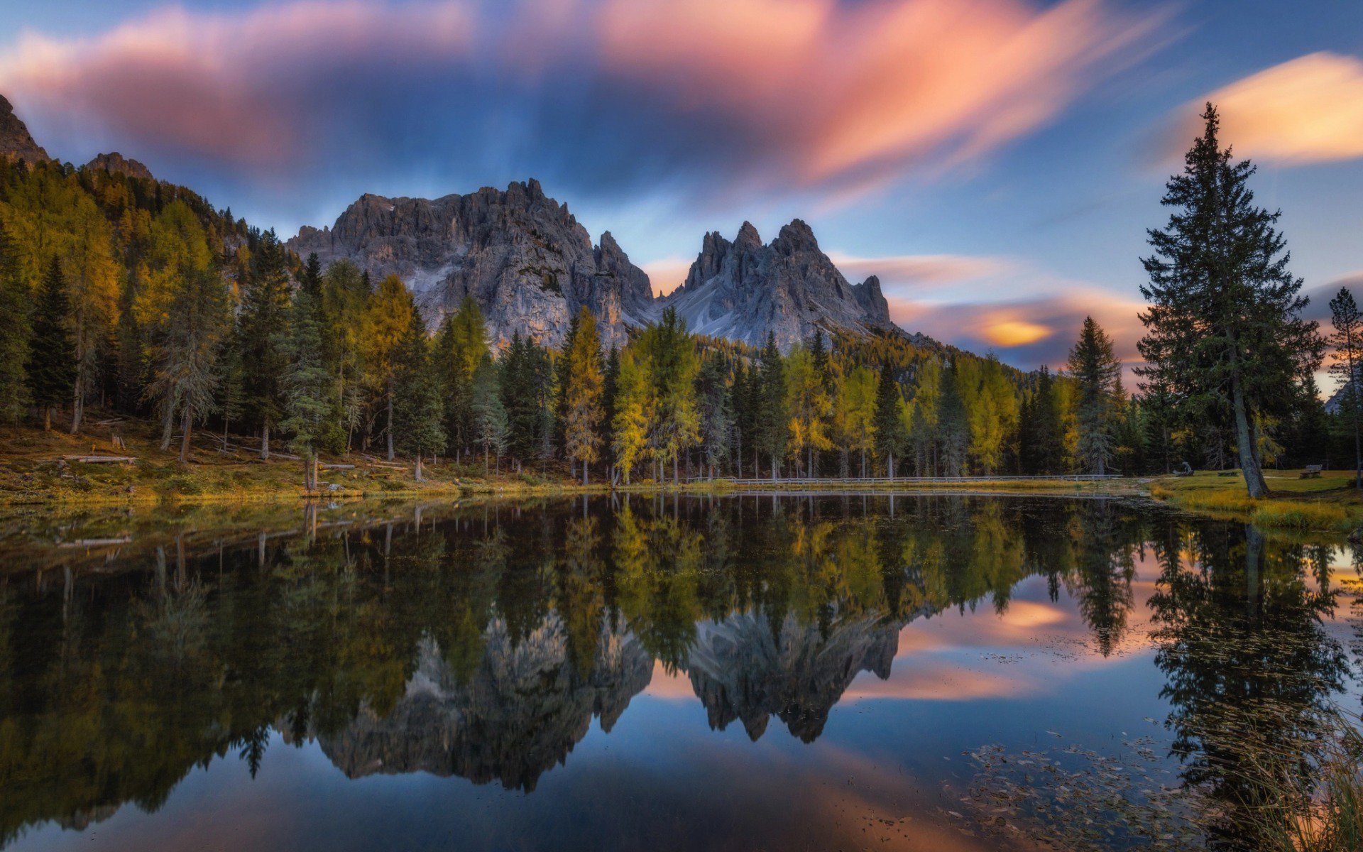 Description: A mountain range is reflected in a lake at sunset with a colorful sky and clouds above it and trees in the foreground.