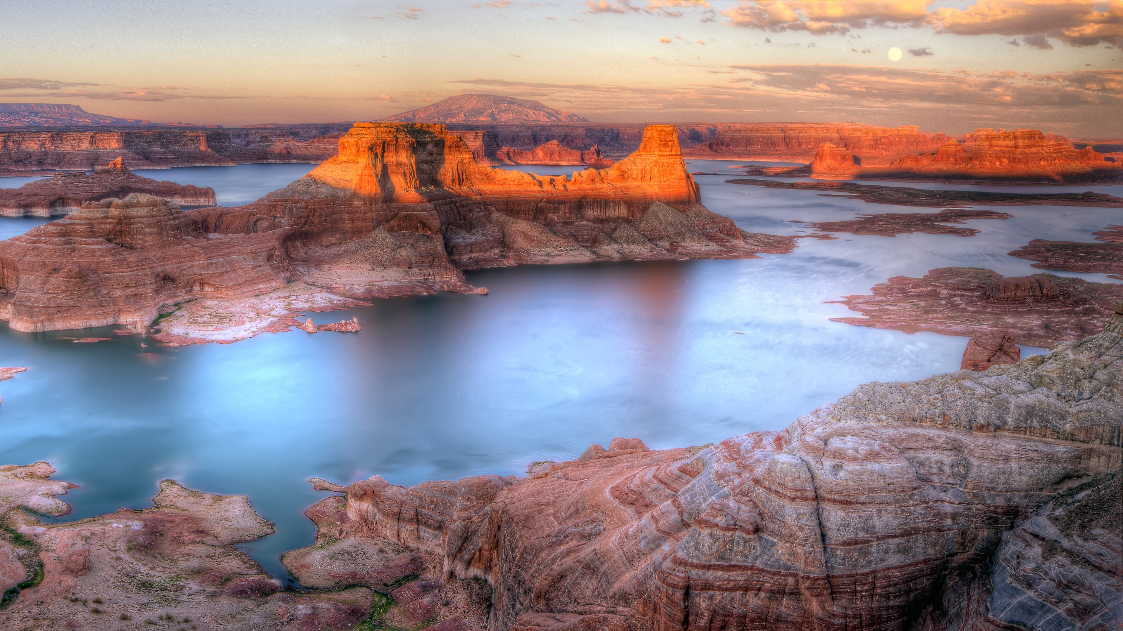 Description: A large body of water surrounded by mountains and rocks at sunset or dawn with a cloudy sky above it.