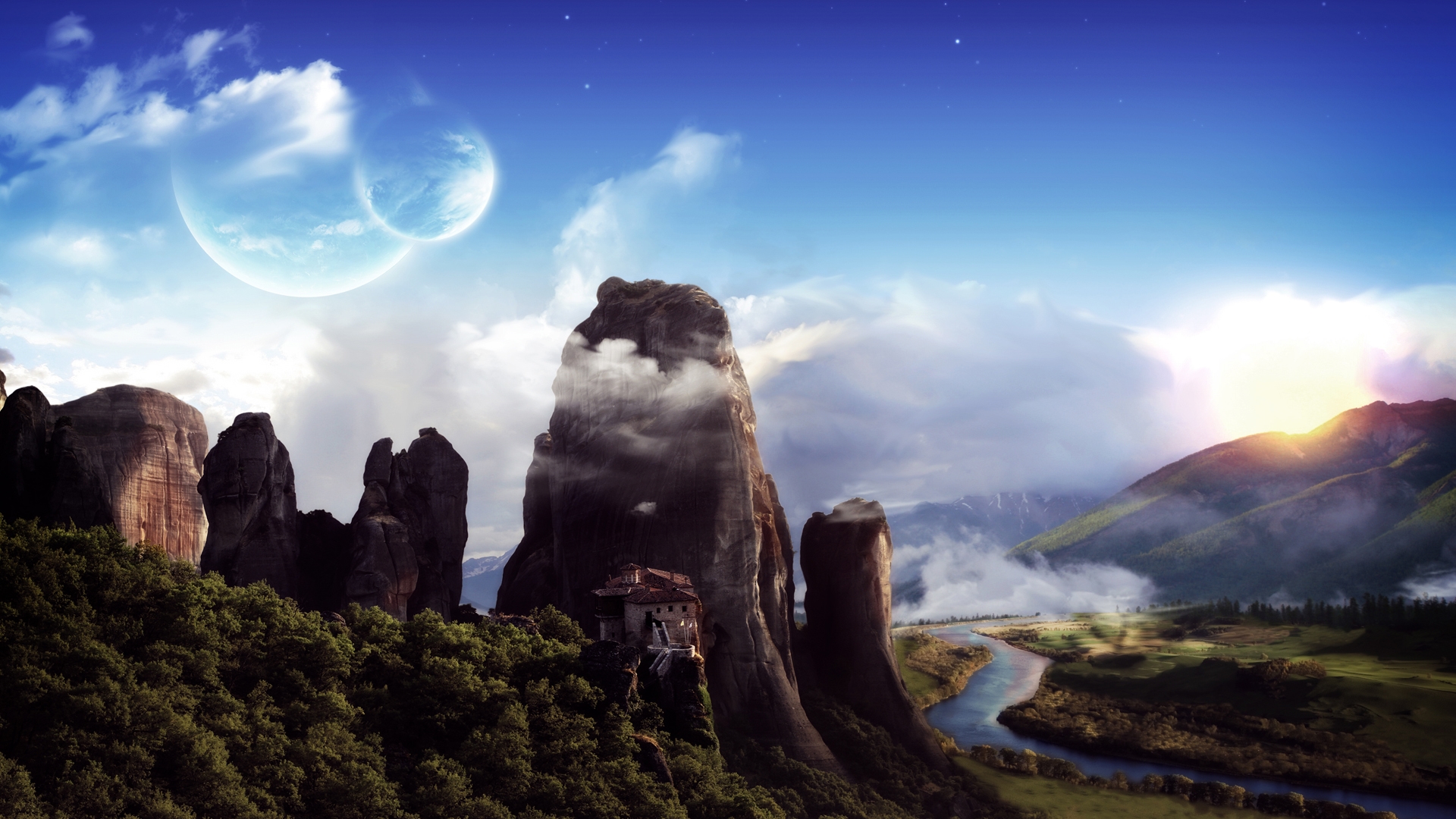 Description: A painting of a mountain landscape with a river running through it and a distant planet in the background with a moon in the sky.
