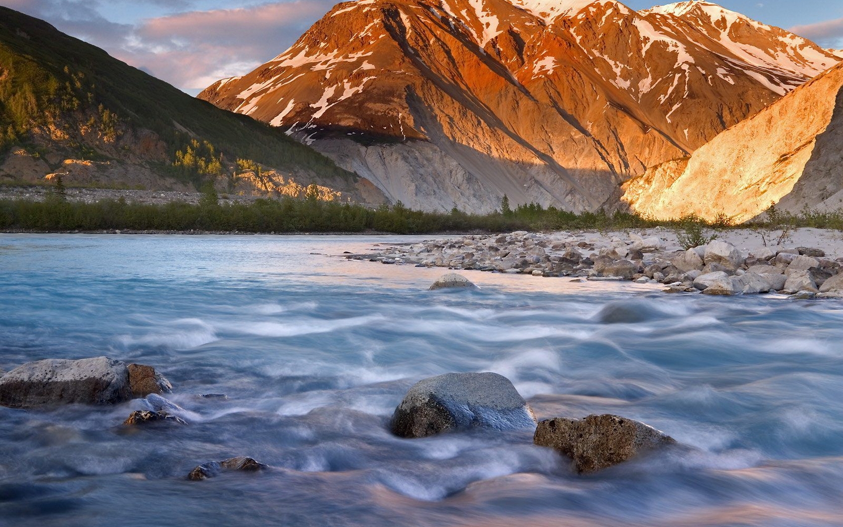 Description: A mountain range is seen in the distance with a river running through it and rocks in the foreground.