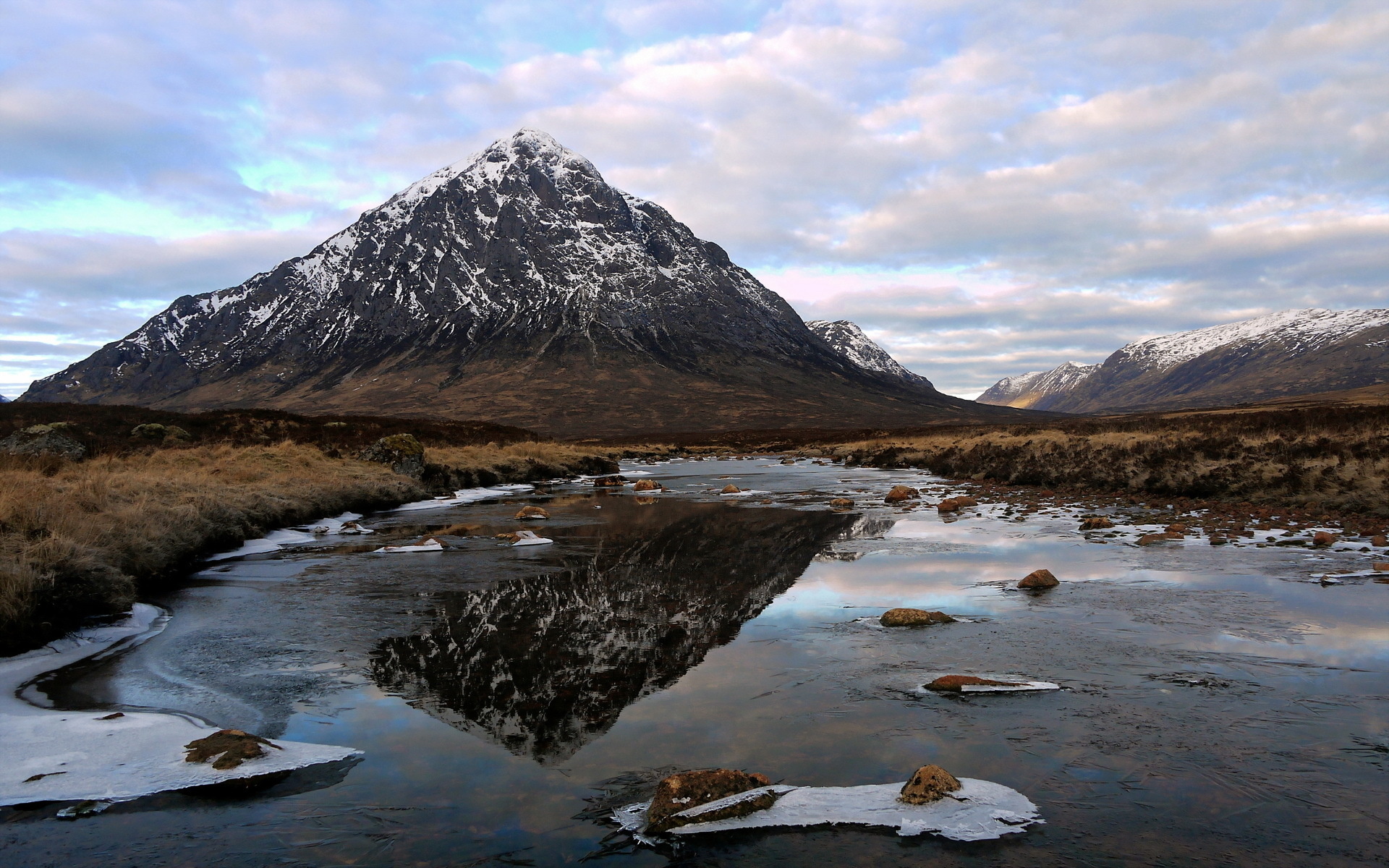 Description: A mountain with a river running through it and snow on the ground and rocks in the water below it.