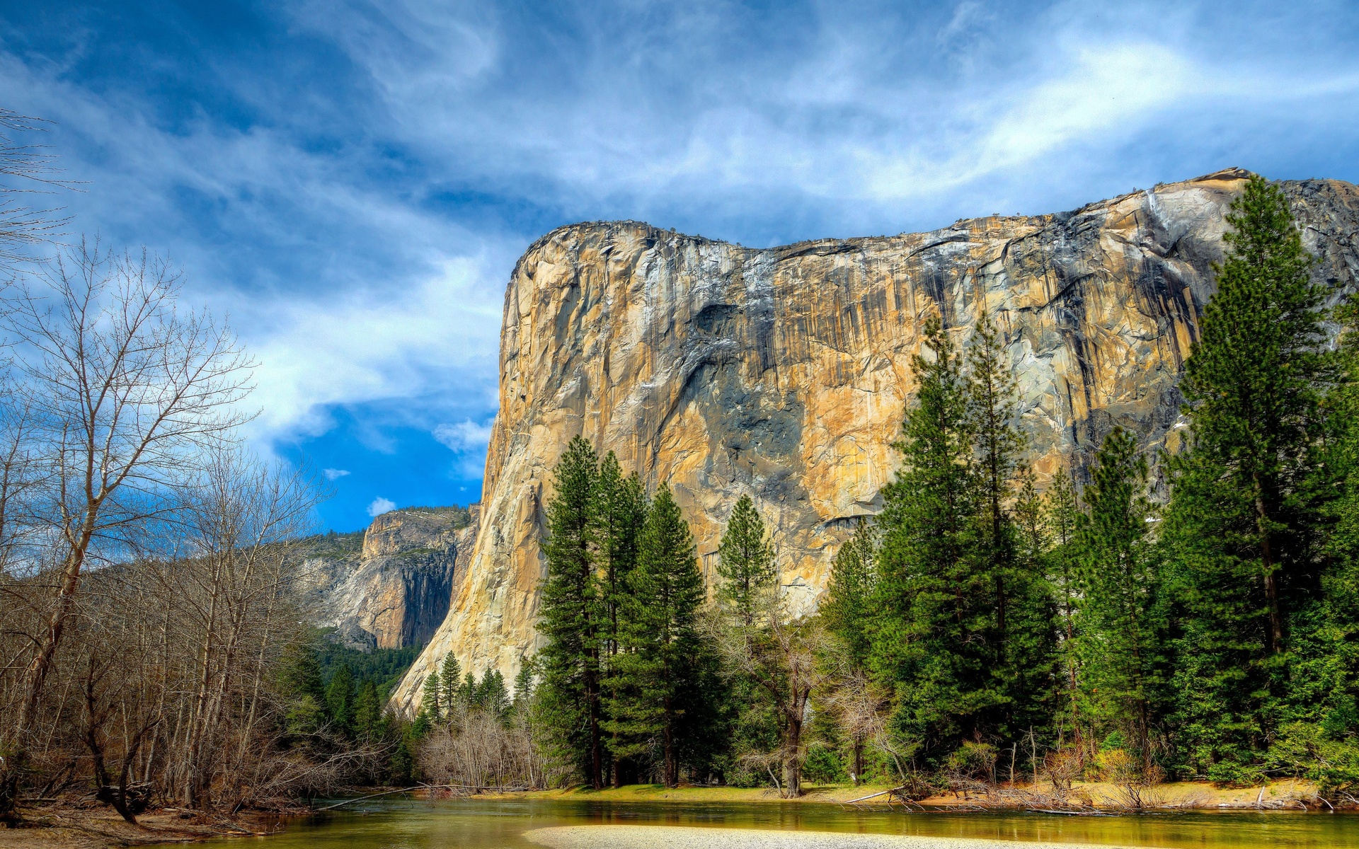 Description: A mountain with a river running through it and trees around it and a blue sky with clouds above it.