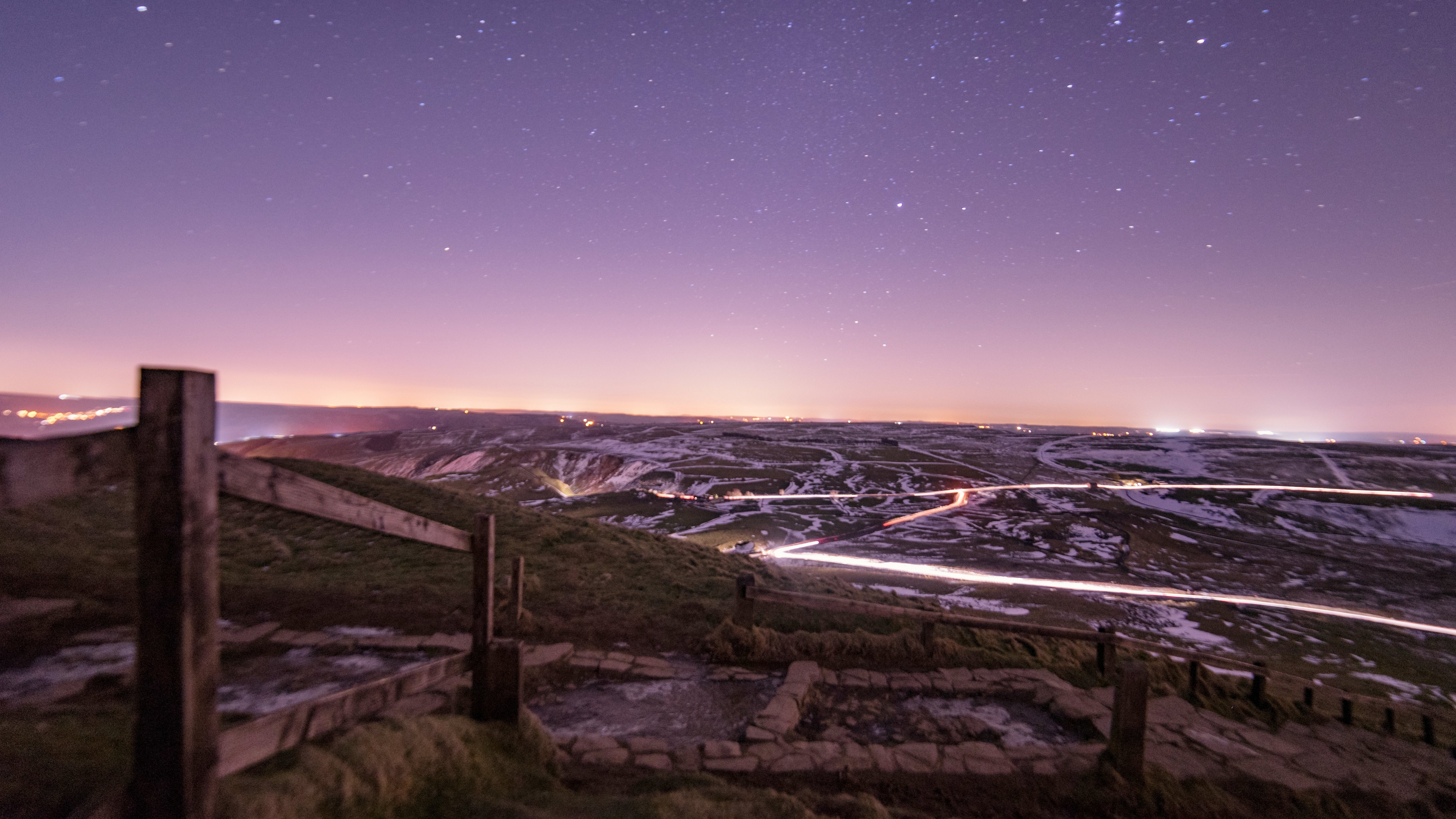 Description: A night time view of a mountain with a road going through it and a city in the distance with lights on.