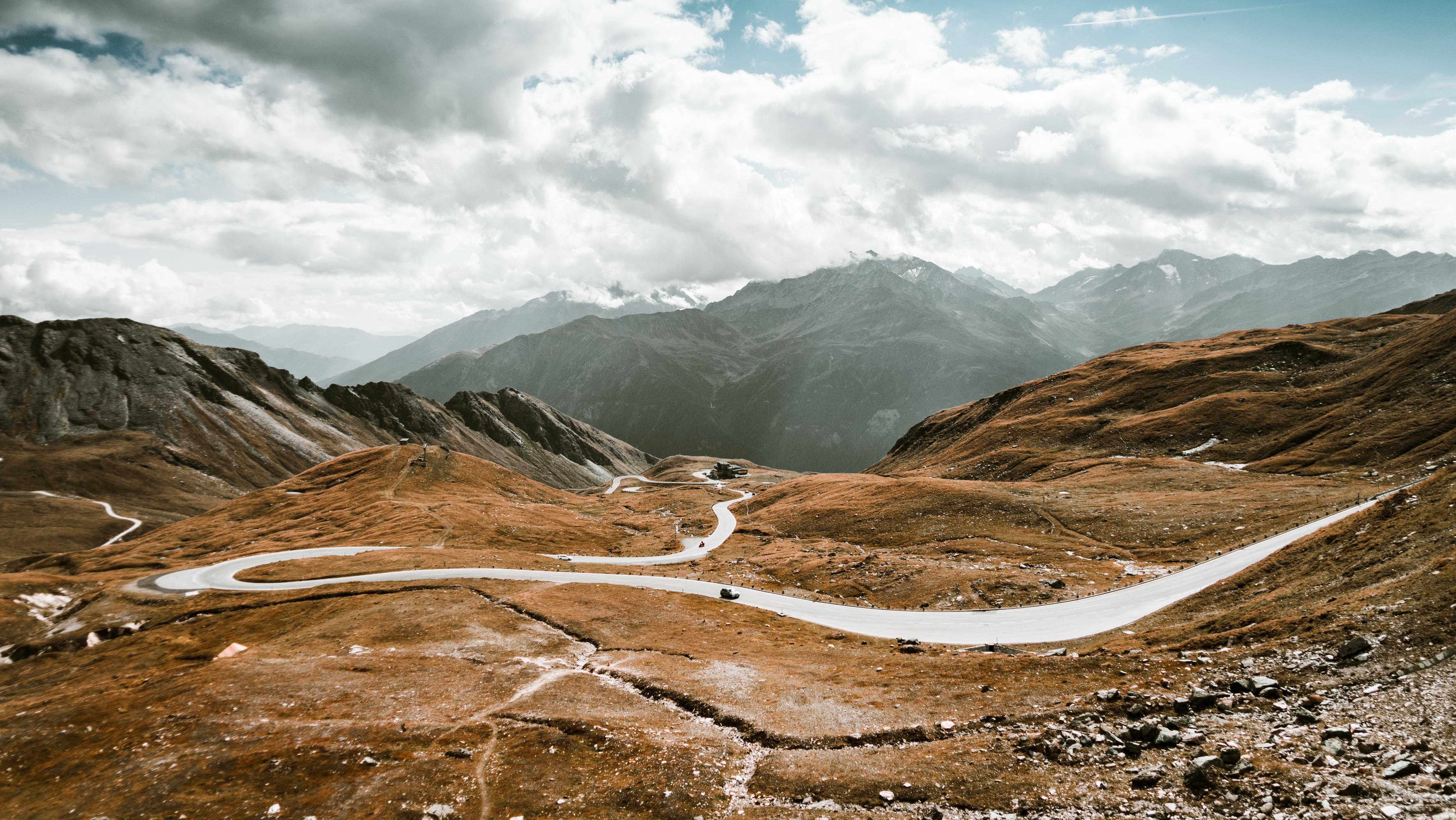 Description: A winding road in the mountains with a sky background and clouds in the sky above it.