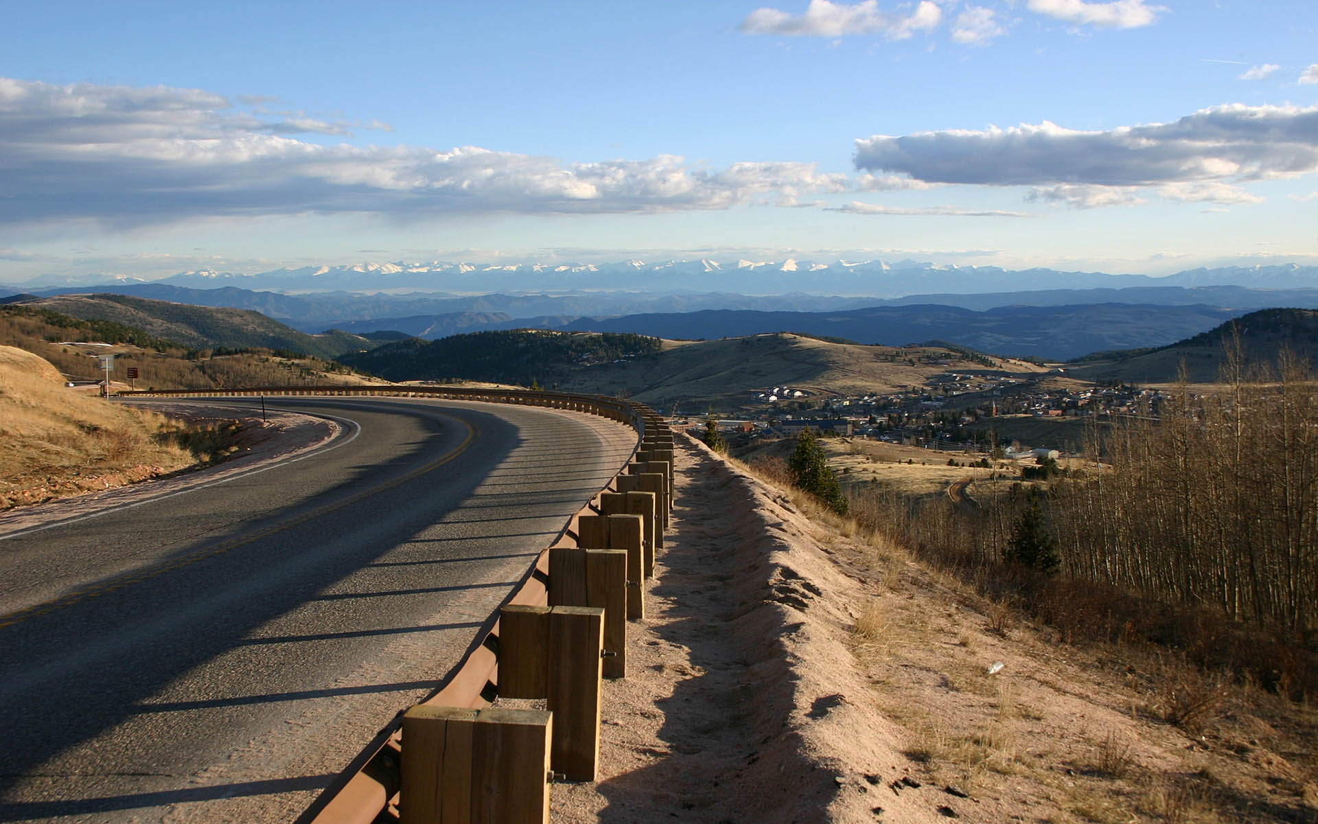 Description: A road with a fence on the side of it and mountains in the background with clouds in the sky.