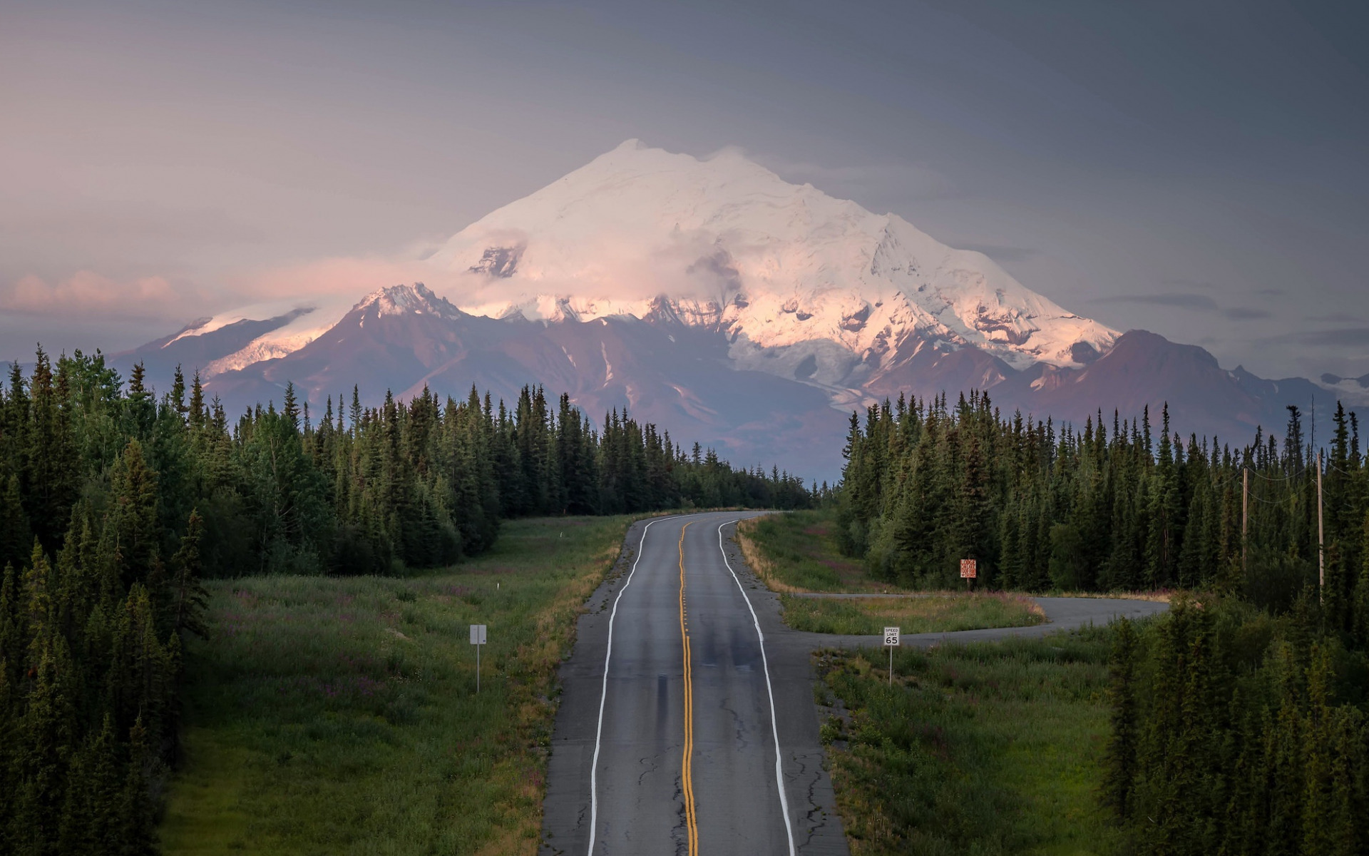 Description: A road with a mountain in the background and trees on both sides of it and a road leading to the bottom.