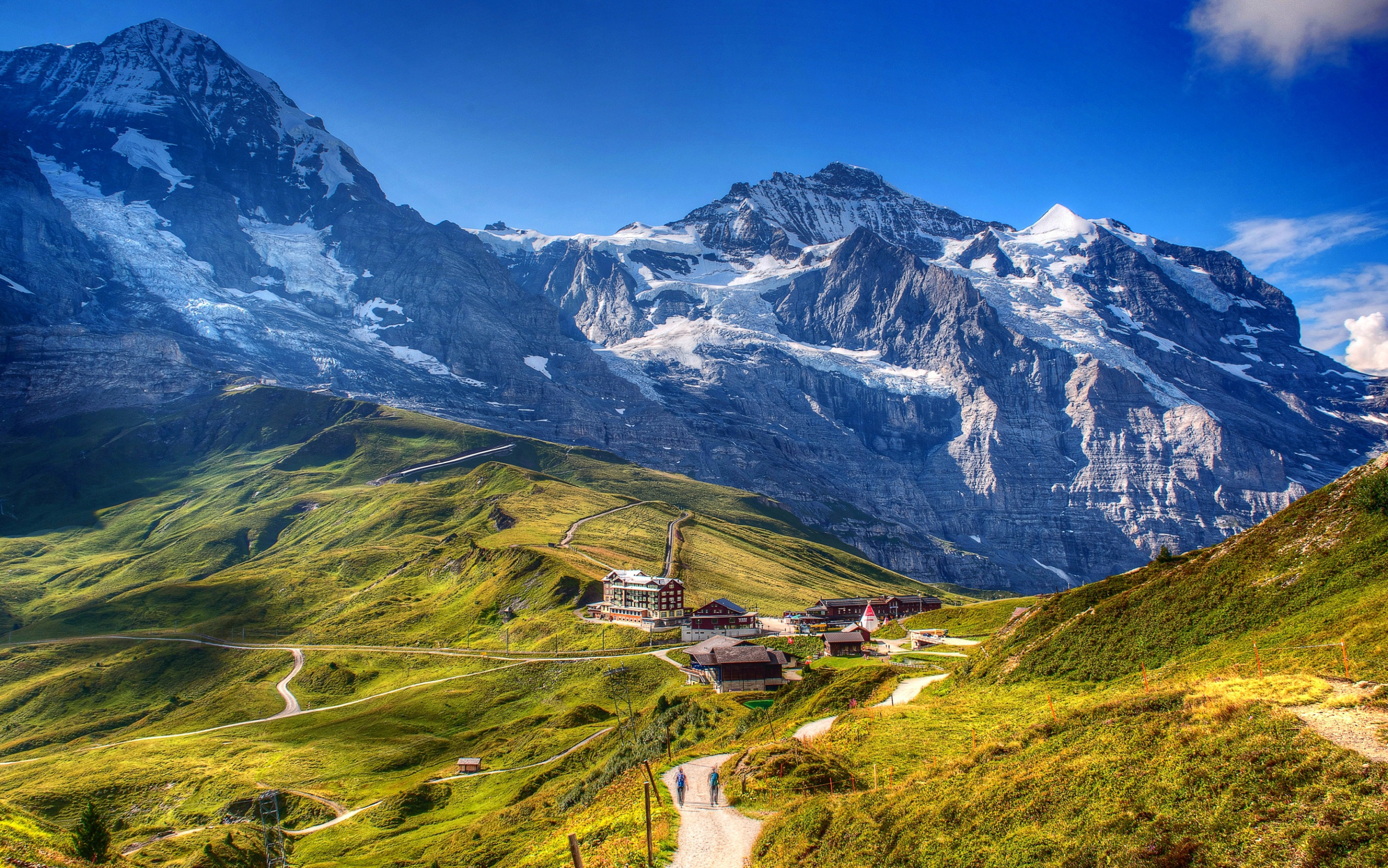 Description: A mountain with a road going through it and a house in the middle of the picture with a mountain in the background.