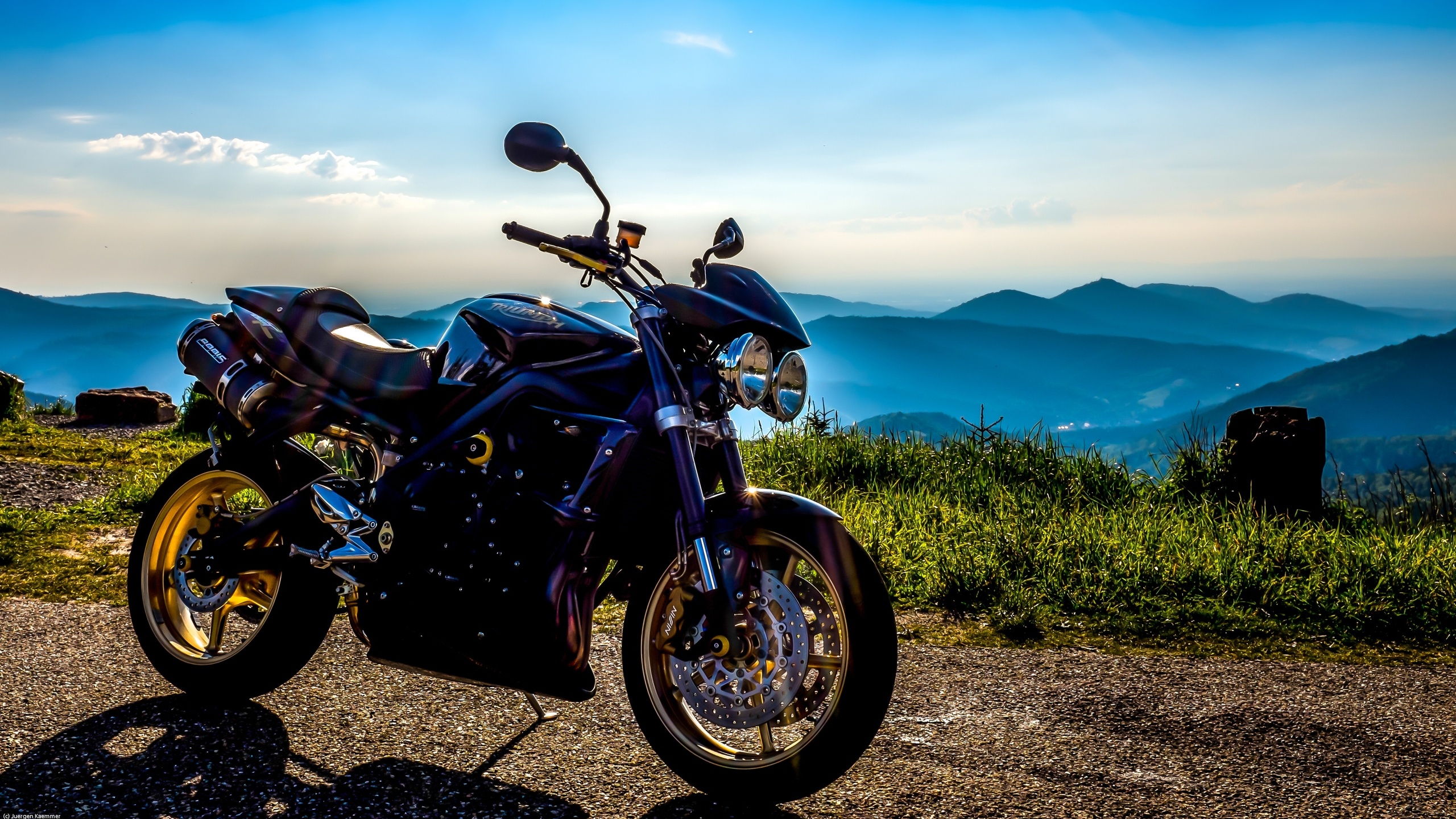 Description: A motorcycle parked on a road in the mountains with a view of the valley below it and a blue sky.
