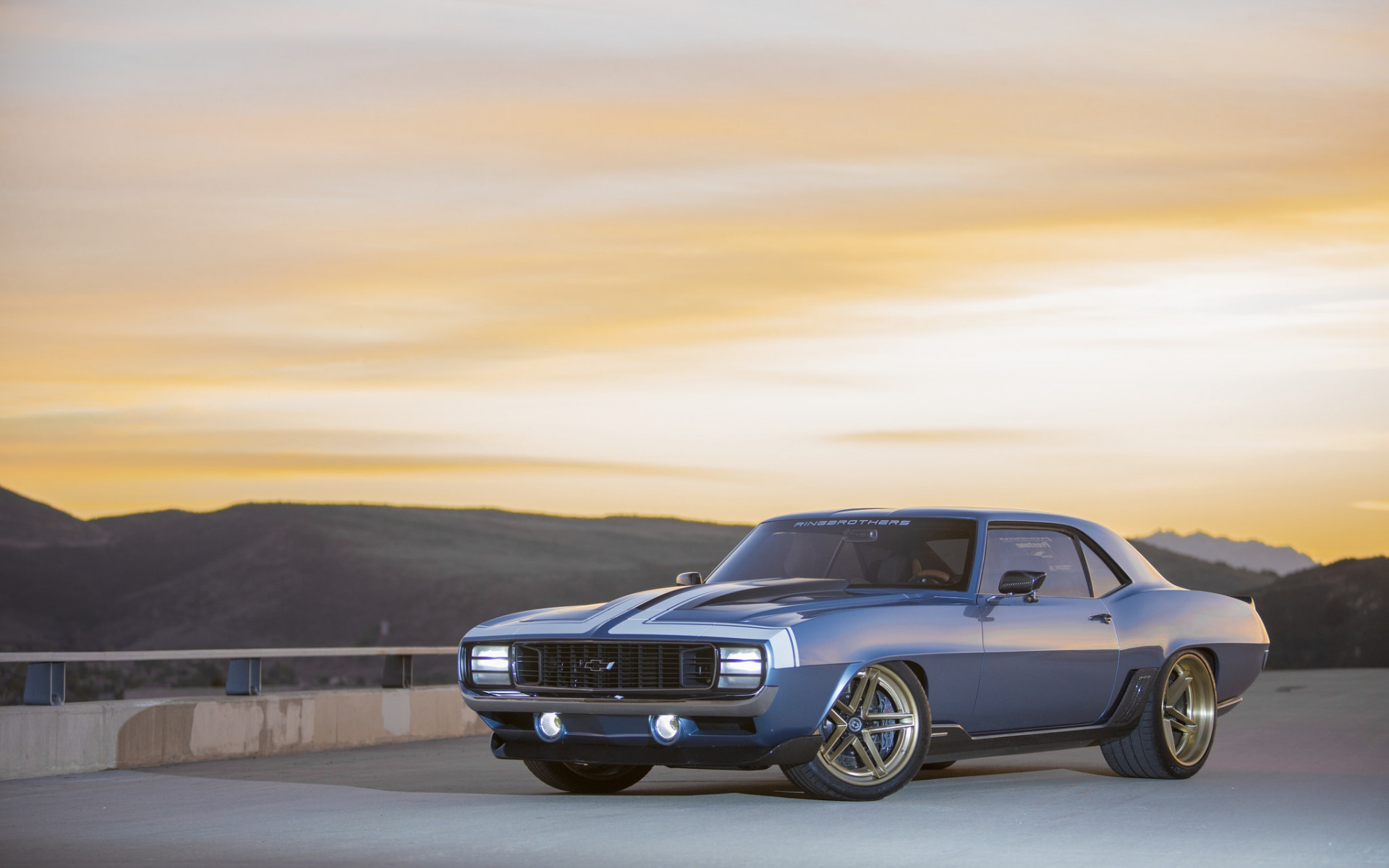 Description: A car that is sitting on a road near mountains and clouds in the sky.