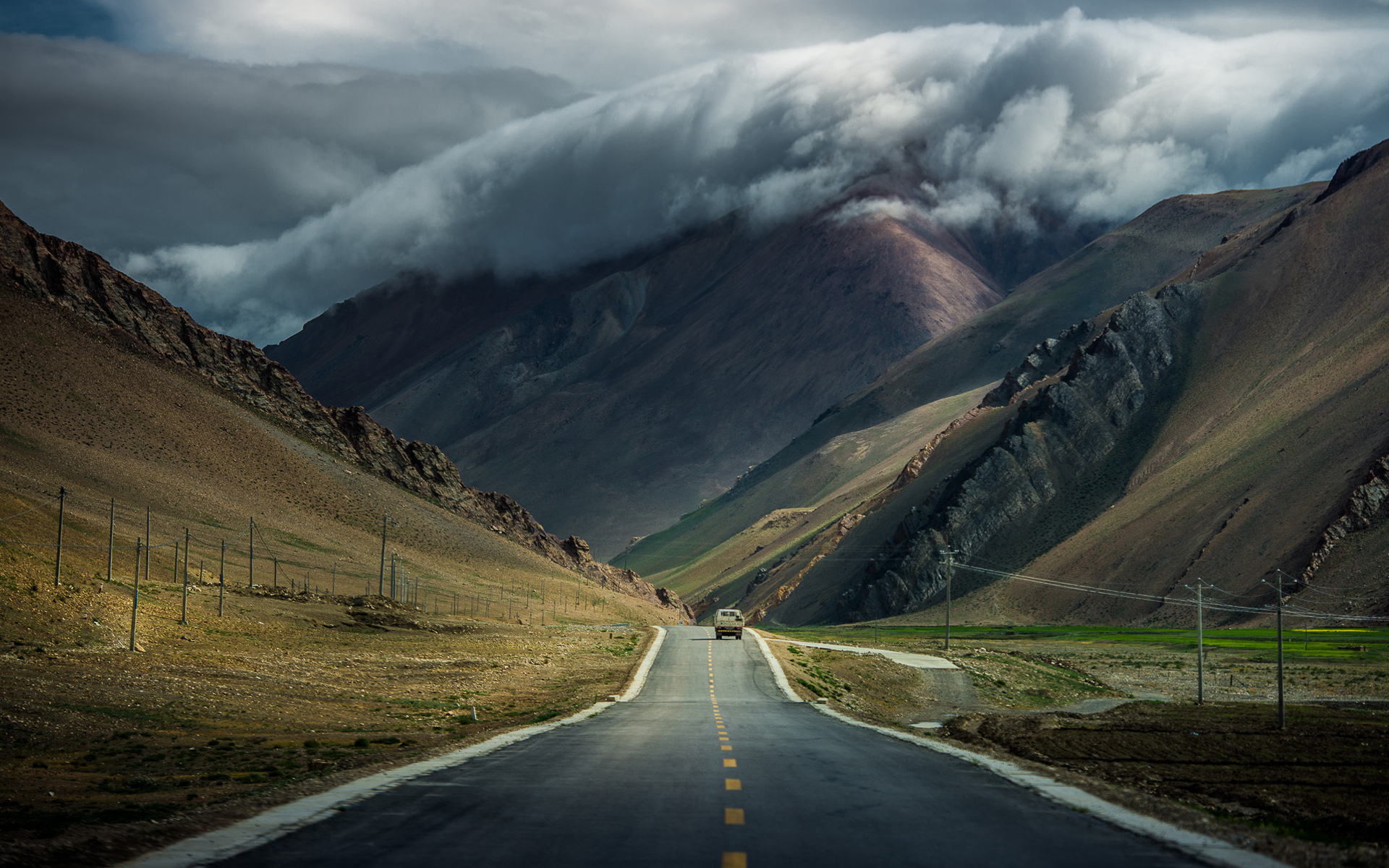 Description: A truck driving down a road in the mountains under a cloudy sky with a mountain range in the background.
