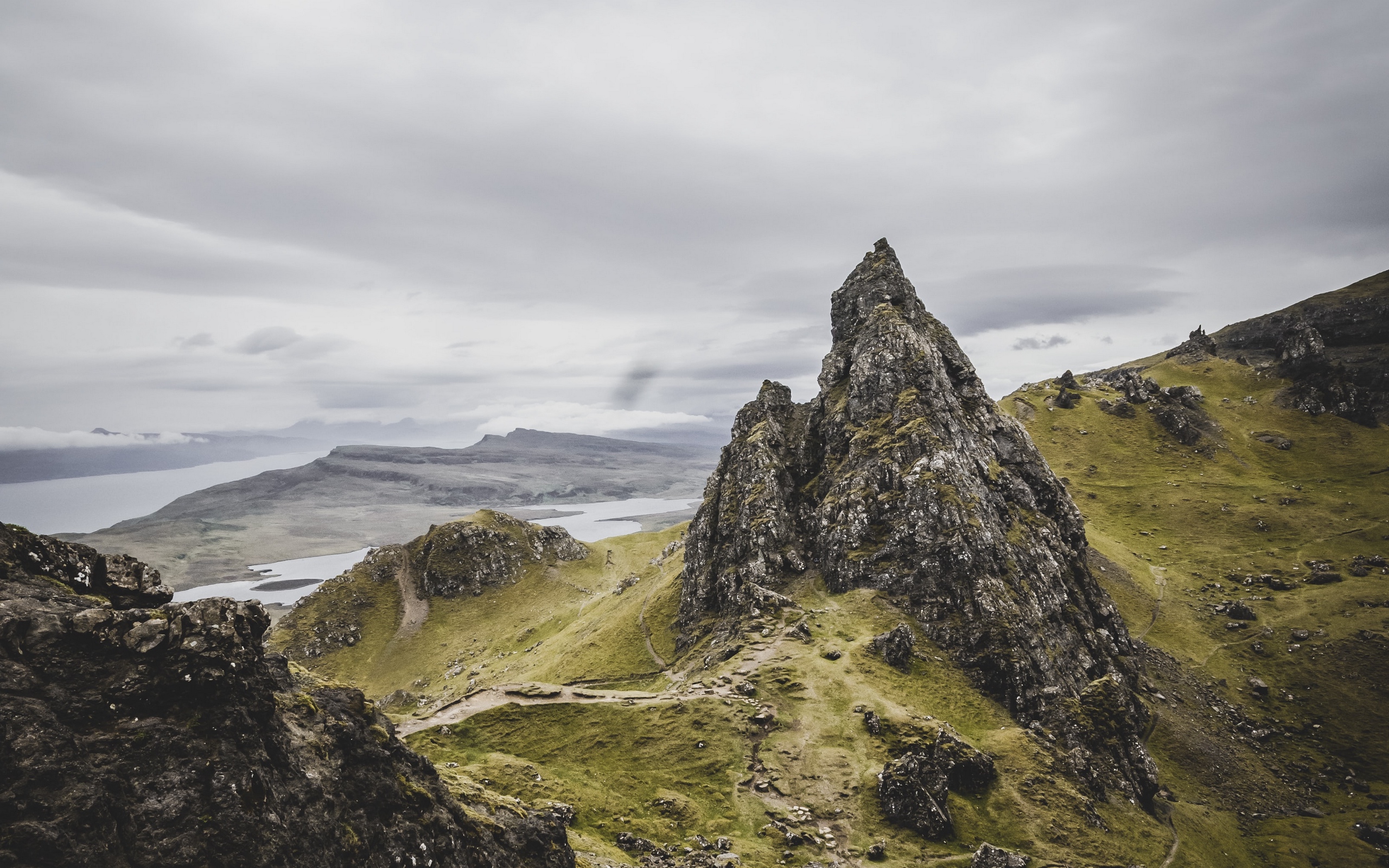 Description: A mountain with a very tall rock formation in the middle of it's landscape.