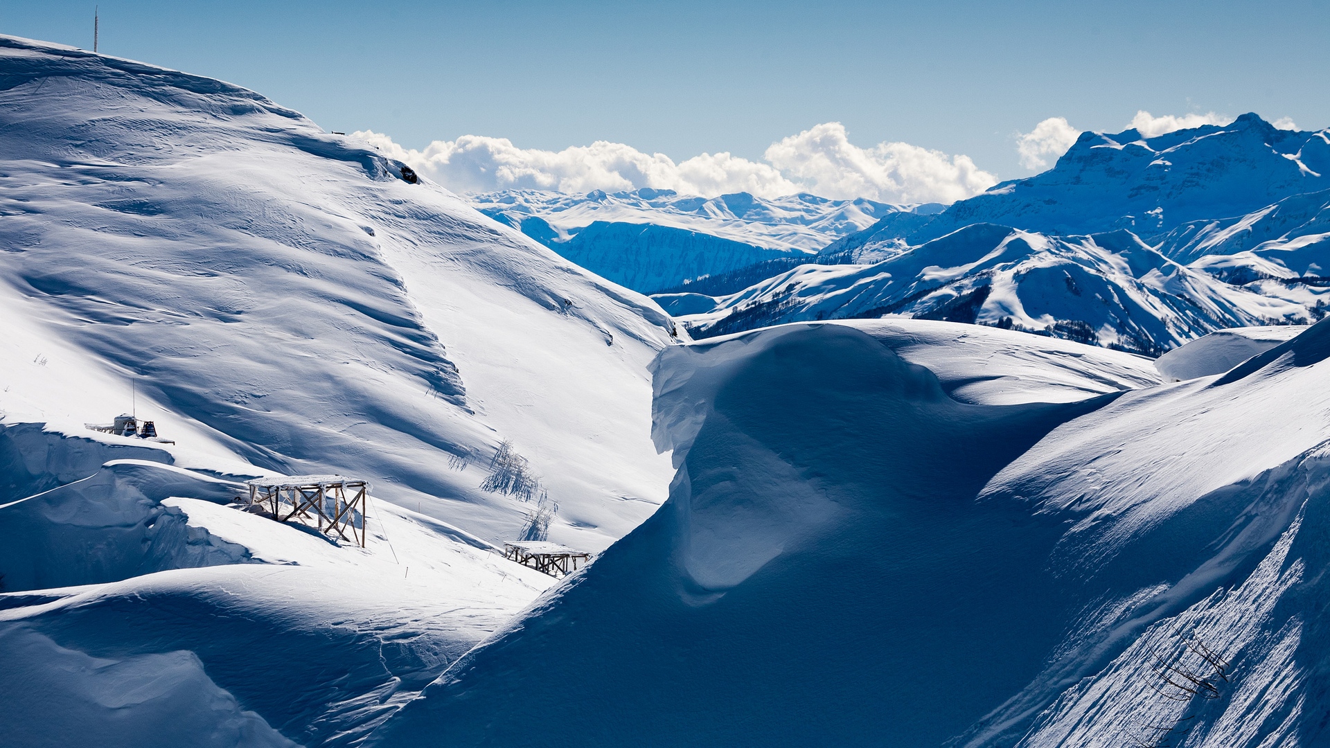 Description: A mountain with a ski lift going down it's side in the snow with mountains in the background.