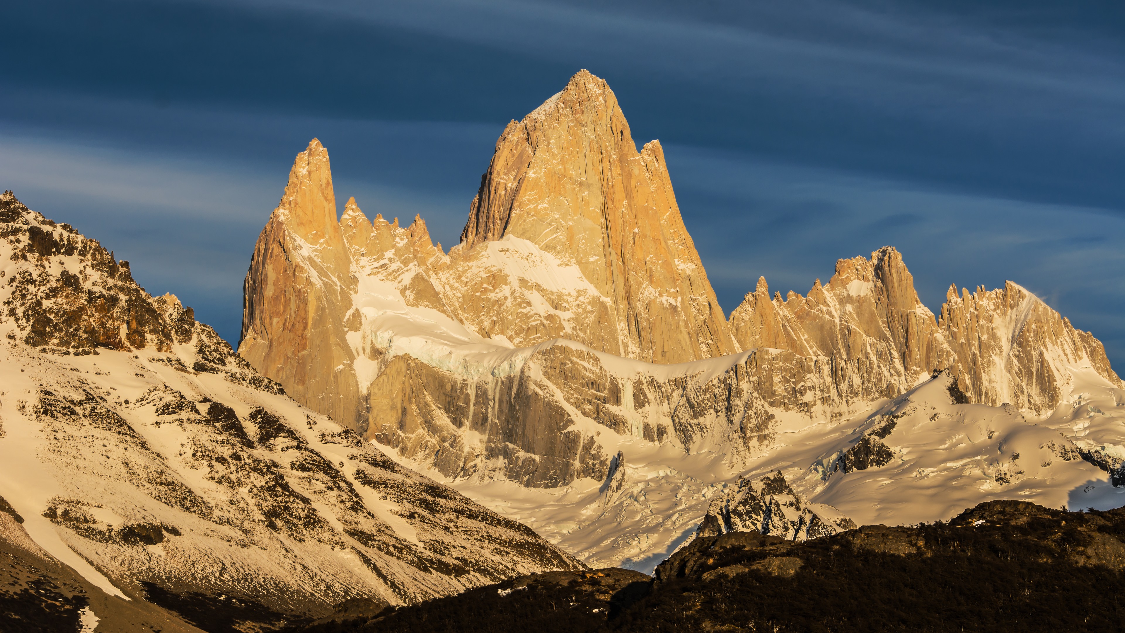 Description: A mountain range with snow on the top and a blue sky above it with clouds in the background and a few light clouds in the sky.