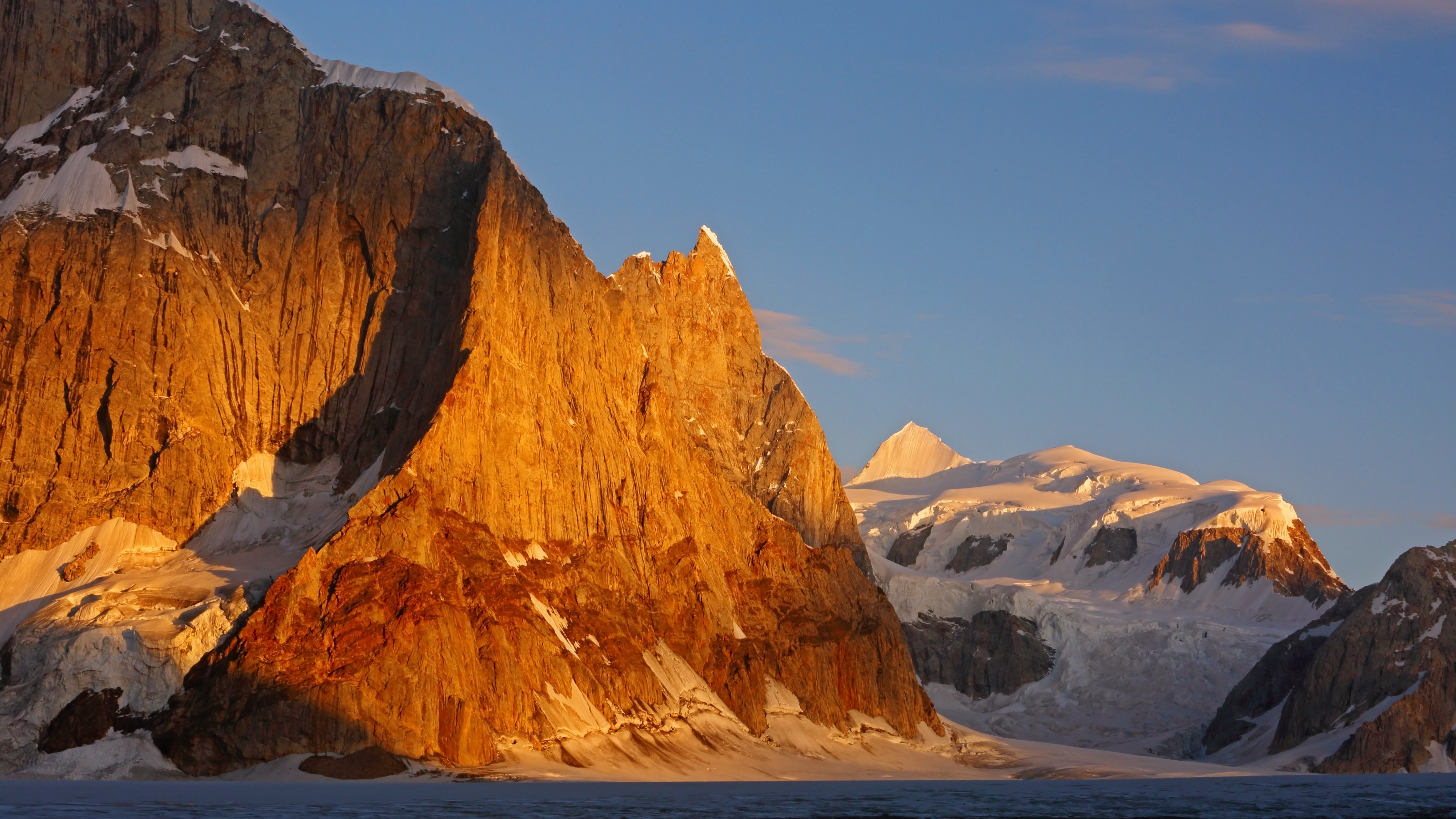 Description: A mountain range with snow on the top and a blue sky above it with a few clouds in the sky.