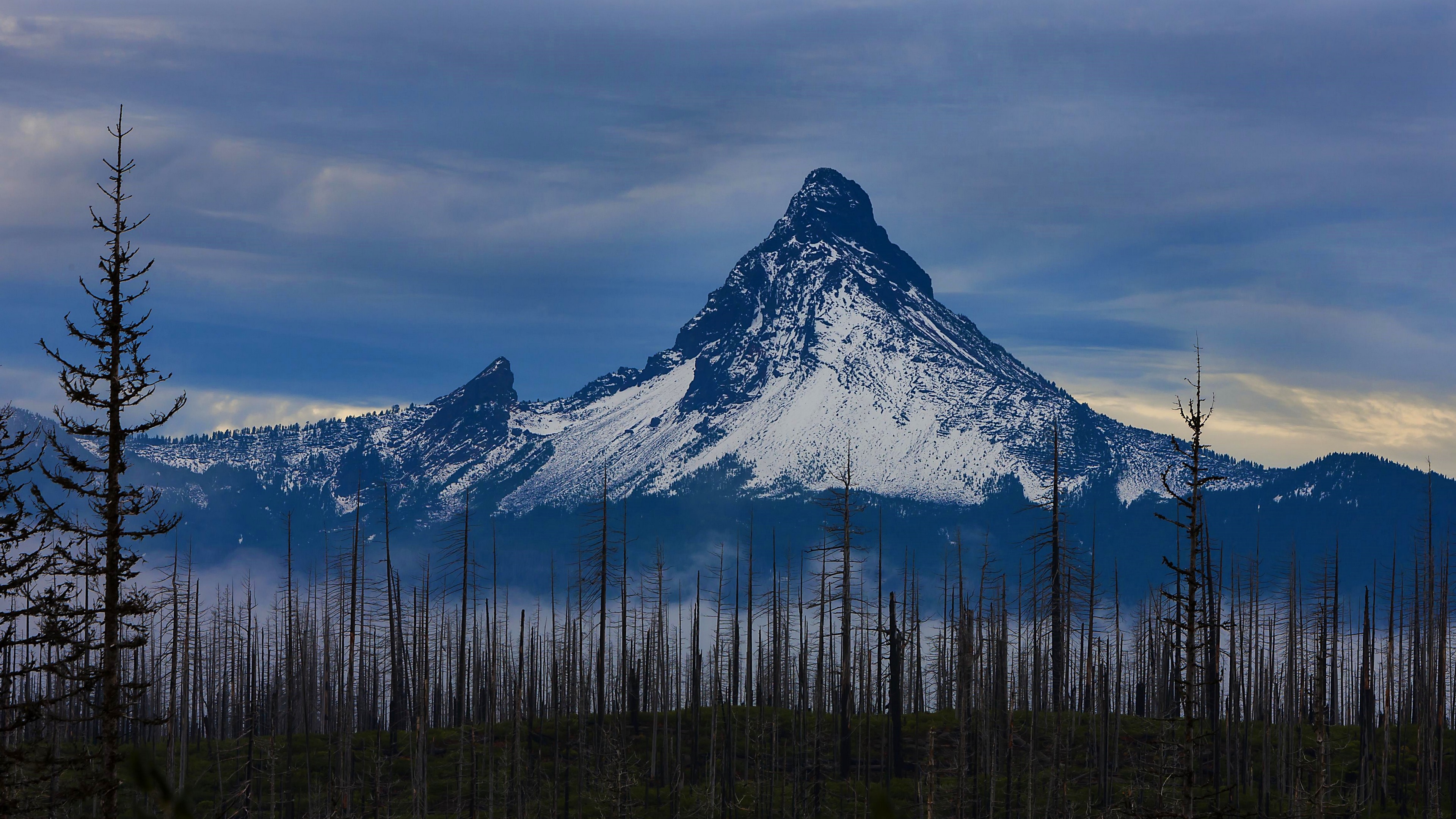 Description: A mountain with a snow covered peak in the distance with trees in the foreground and a forest of dead trees in the foreground.