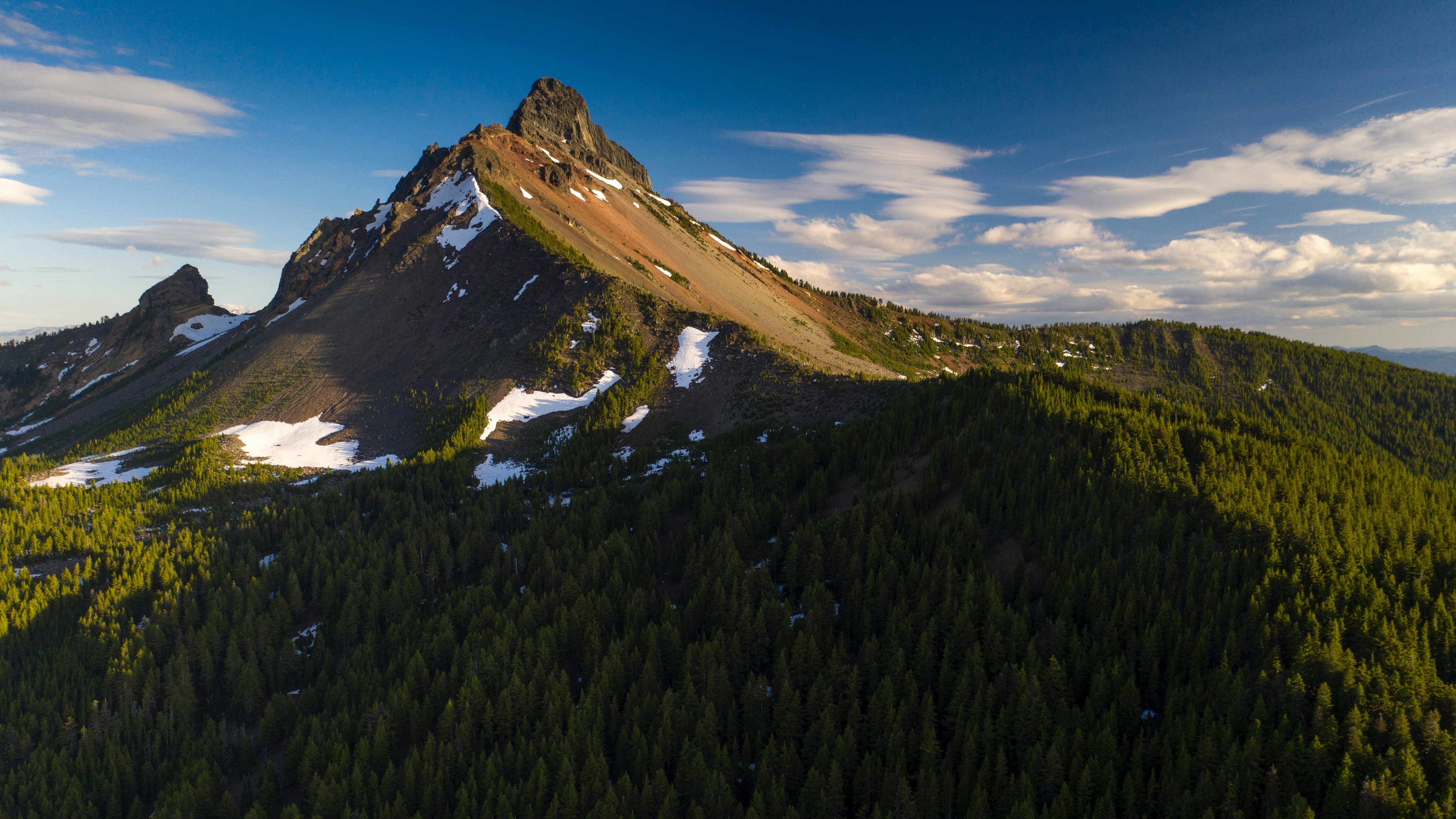 Description: A mountain with a snow covered peak and trees on the side of it.