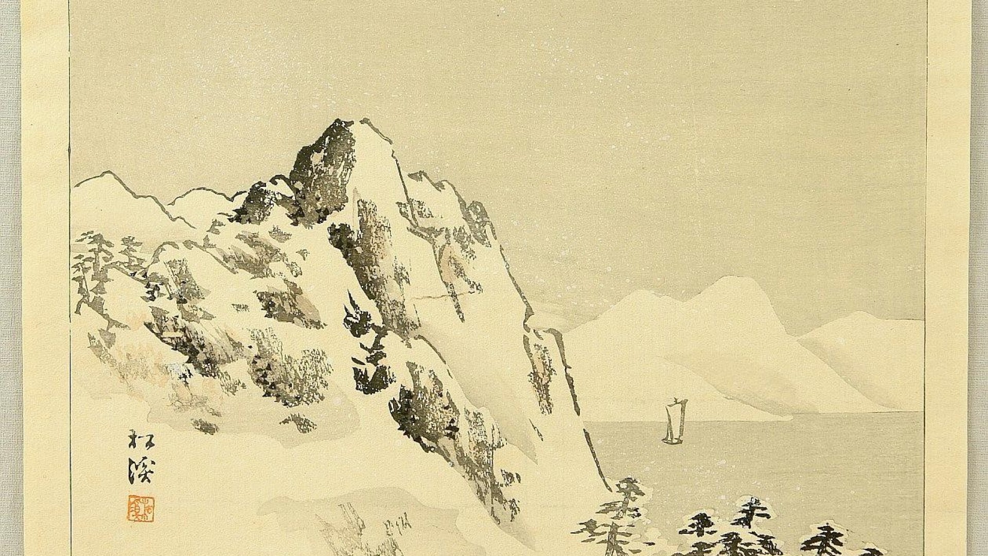 Description: A painting of a mountain with trees and a person on a snowboard in the snow with a sky background.