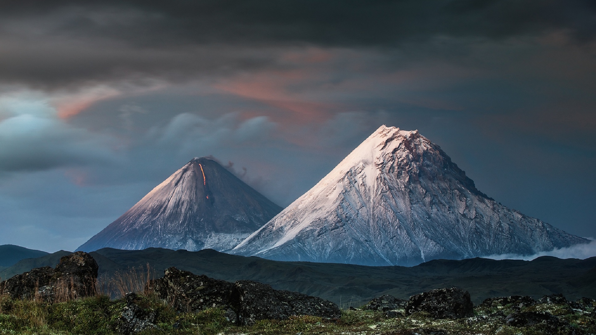 Description: A mountain with a snow capped peak under a cloudy sky with a few clouds above it and a green field below.