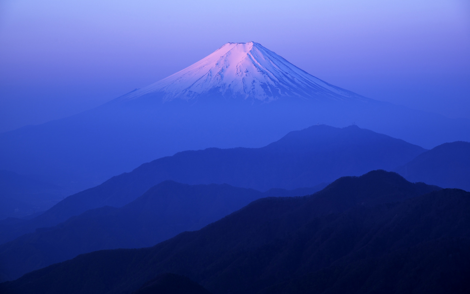 Description: A mountain with a snow capped peak in the distance at dusk with a blue sky and a few clouds.