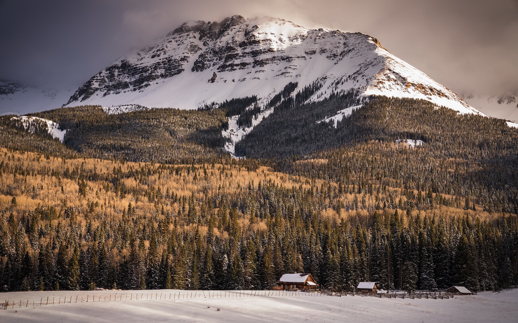 Description: A mountain with a snow covered forest below it and a cabin in the foreground with a cloudy sky.