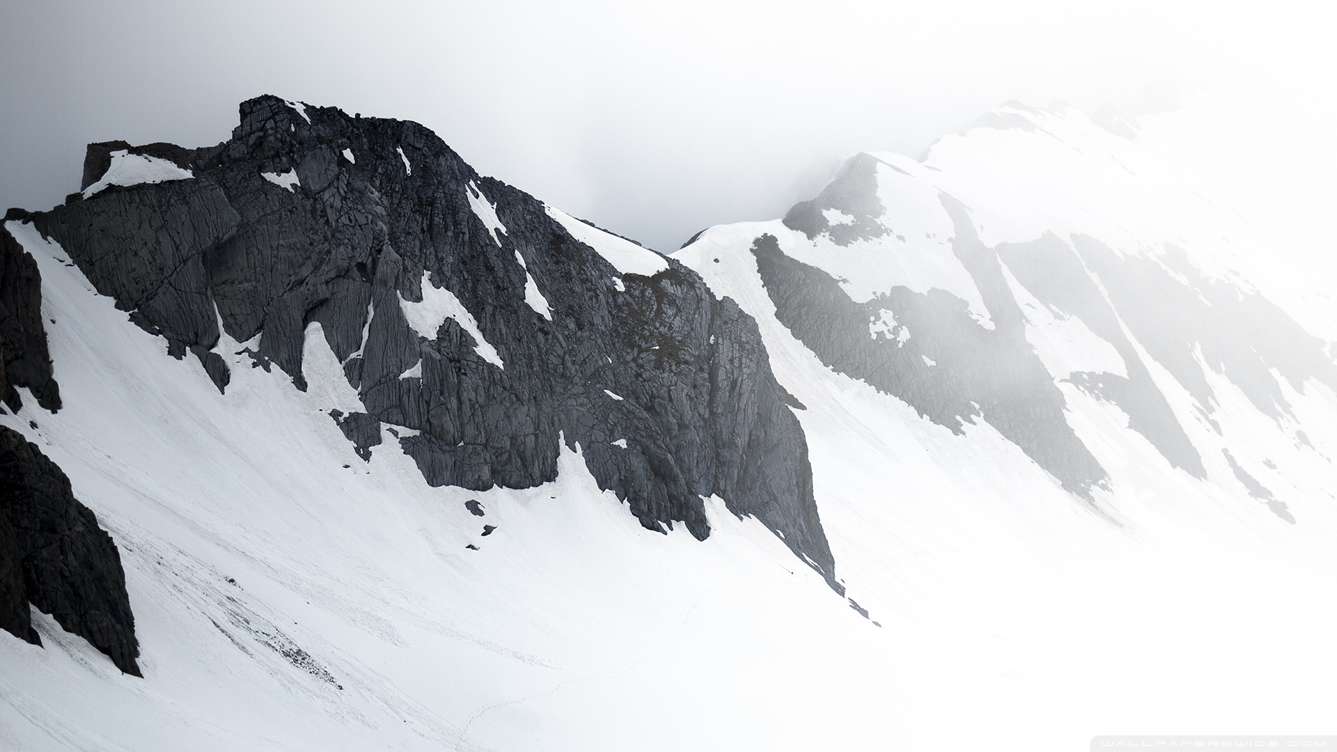 Description: A mountain with a very tall peak covered in snow and fog in the distance is a cloudy sky with a few clouds.