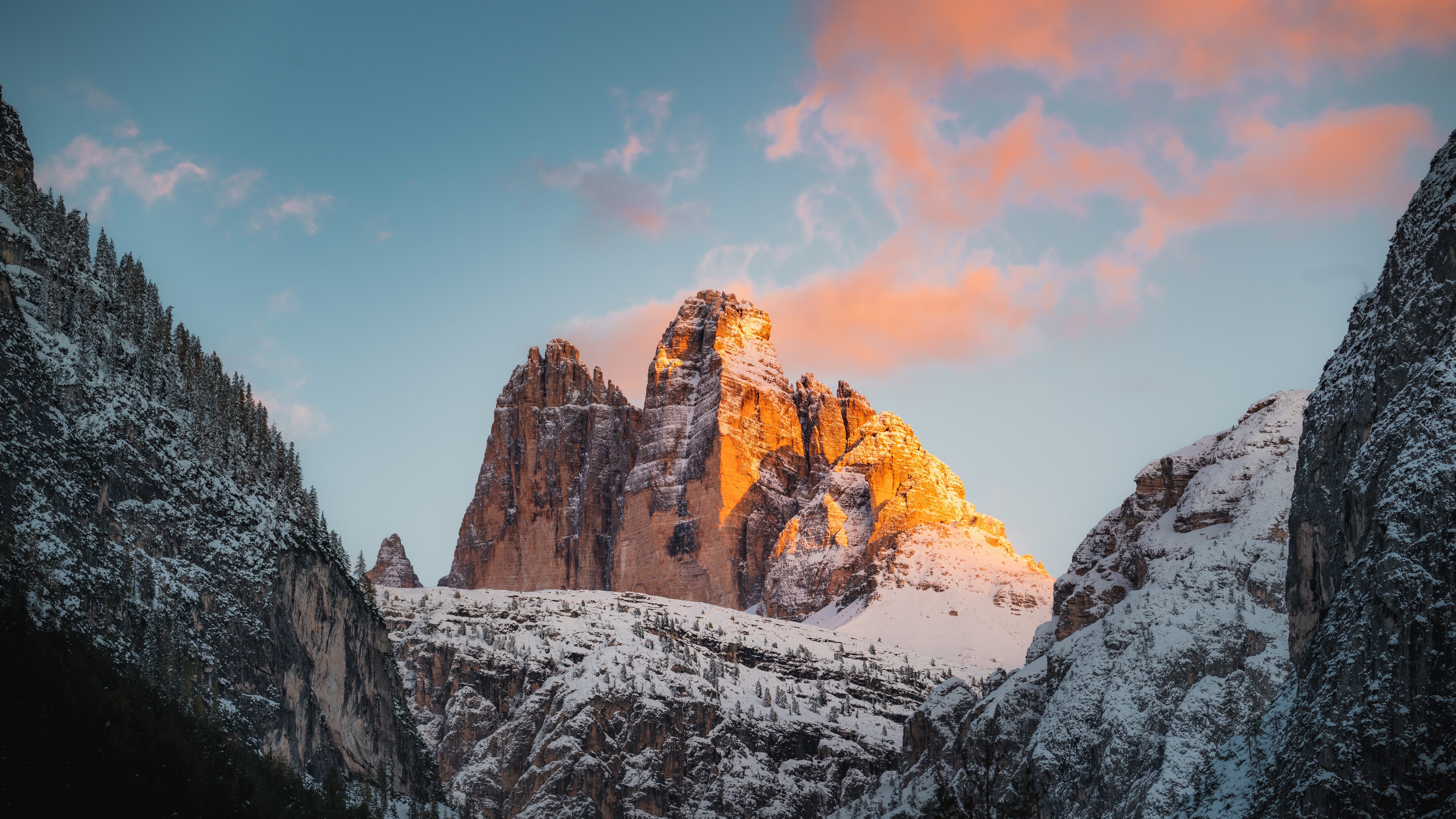 Description: A mountain with a snow covered top and a pink sky in the background with clouds in the sky and a few snow on the top of the mountain.