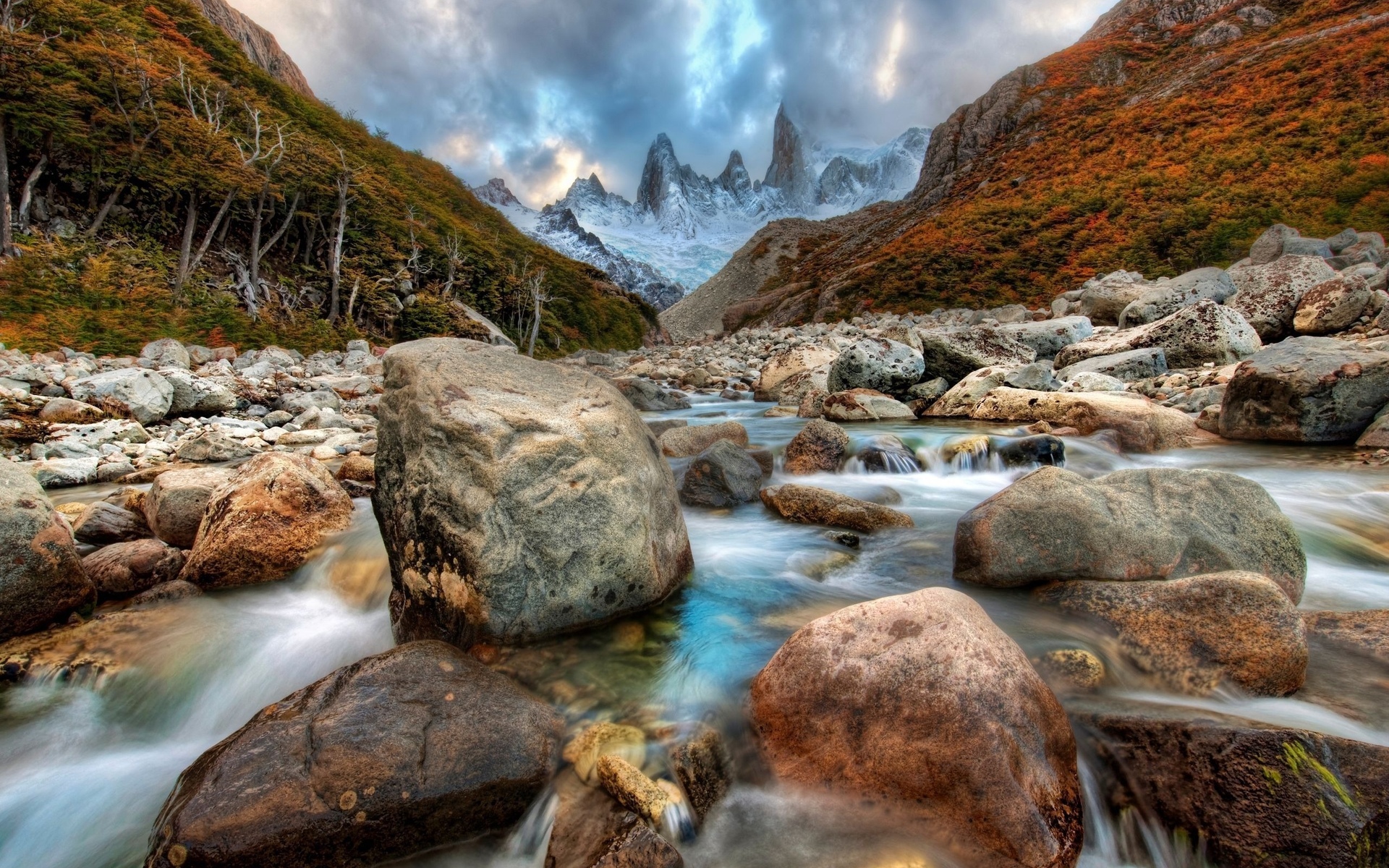 Description: A mountain stream with rocks and water running through it and a cloudy sky above it with mountains in the background.