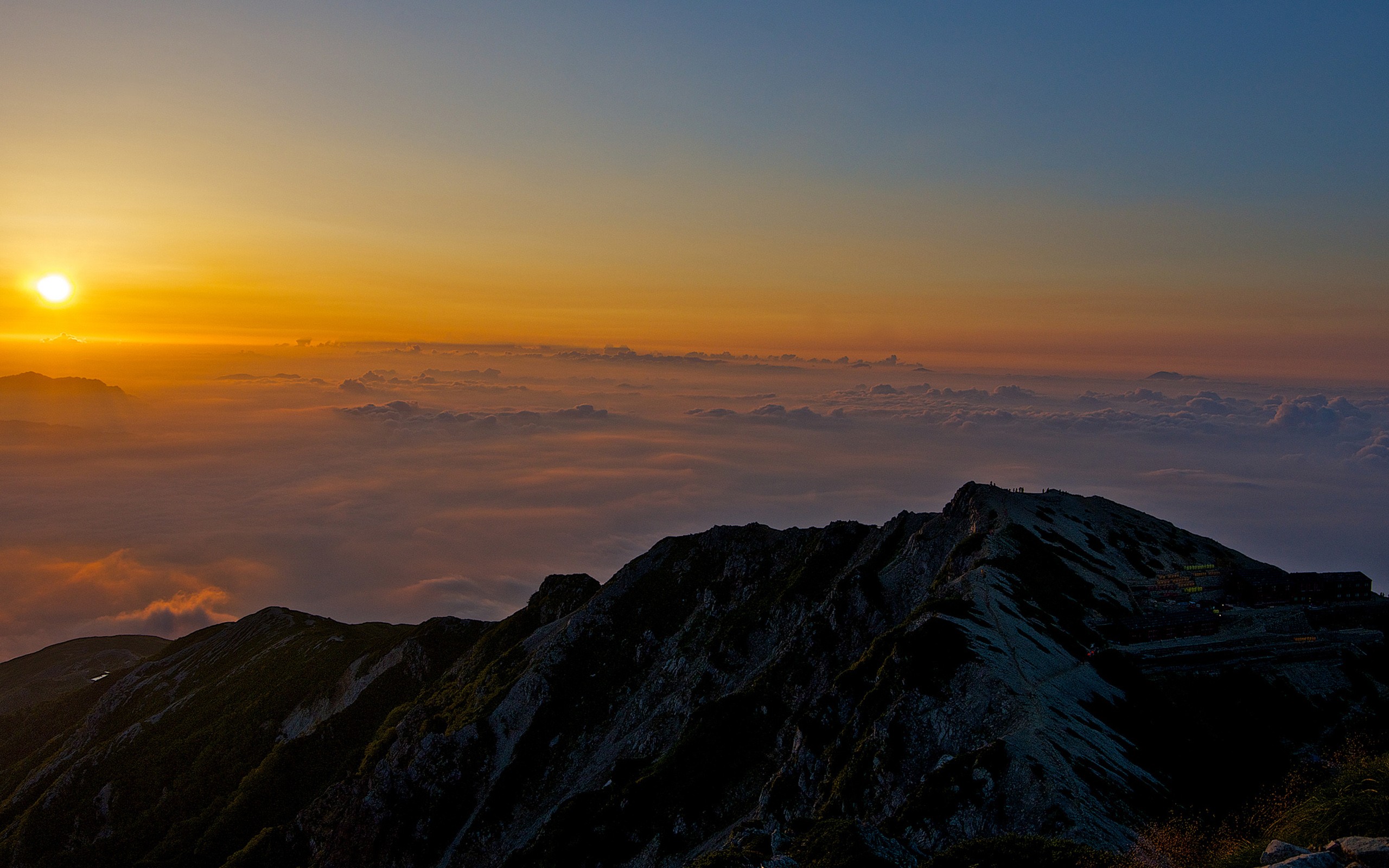 Description: A mountain with a sunset in the background and clouds below it and a few mountains in the foreground.