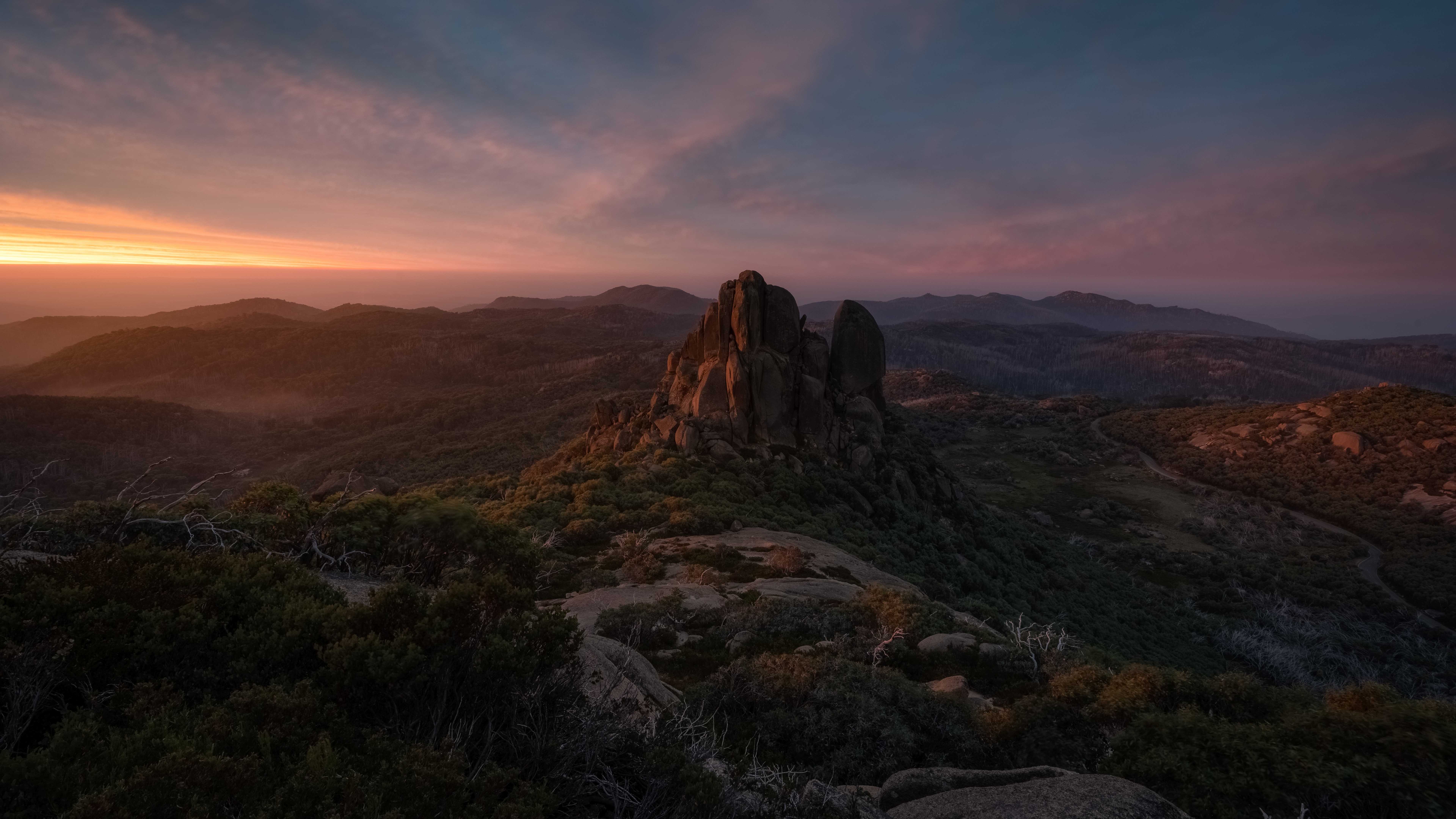 Description: A mountain with a sunset in the background and clouds in the sky above it.