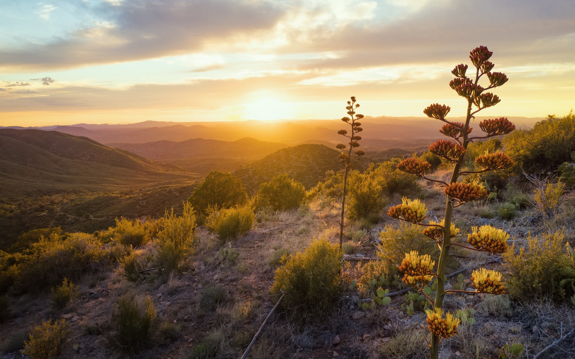 Description: A view of a mountain with a sunset in the background and a plant in the foreground with a few flowers in the foreground.