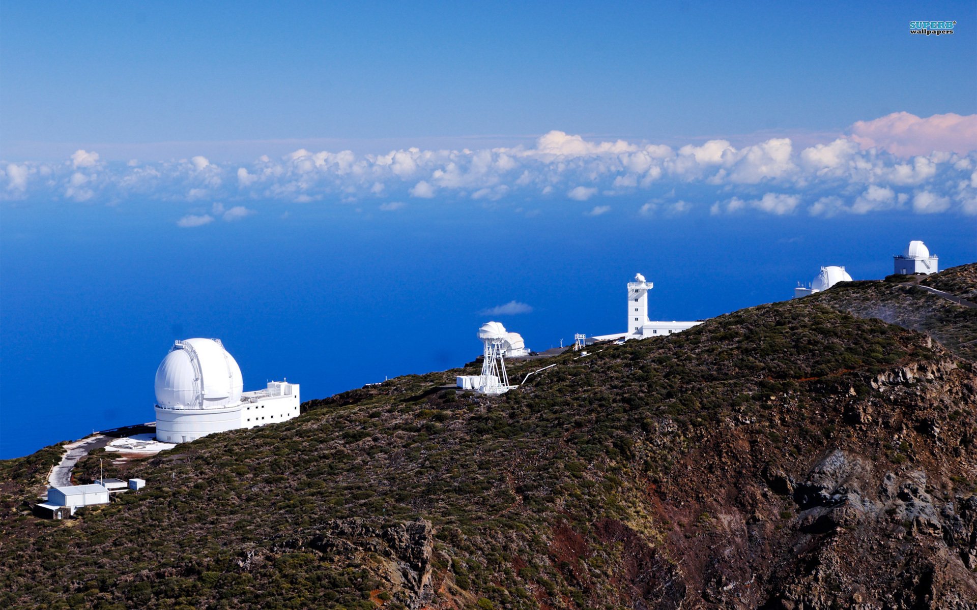 Description: A mountain with a bunch of telescopes on top of it and a body of water in the background with clouds.