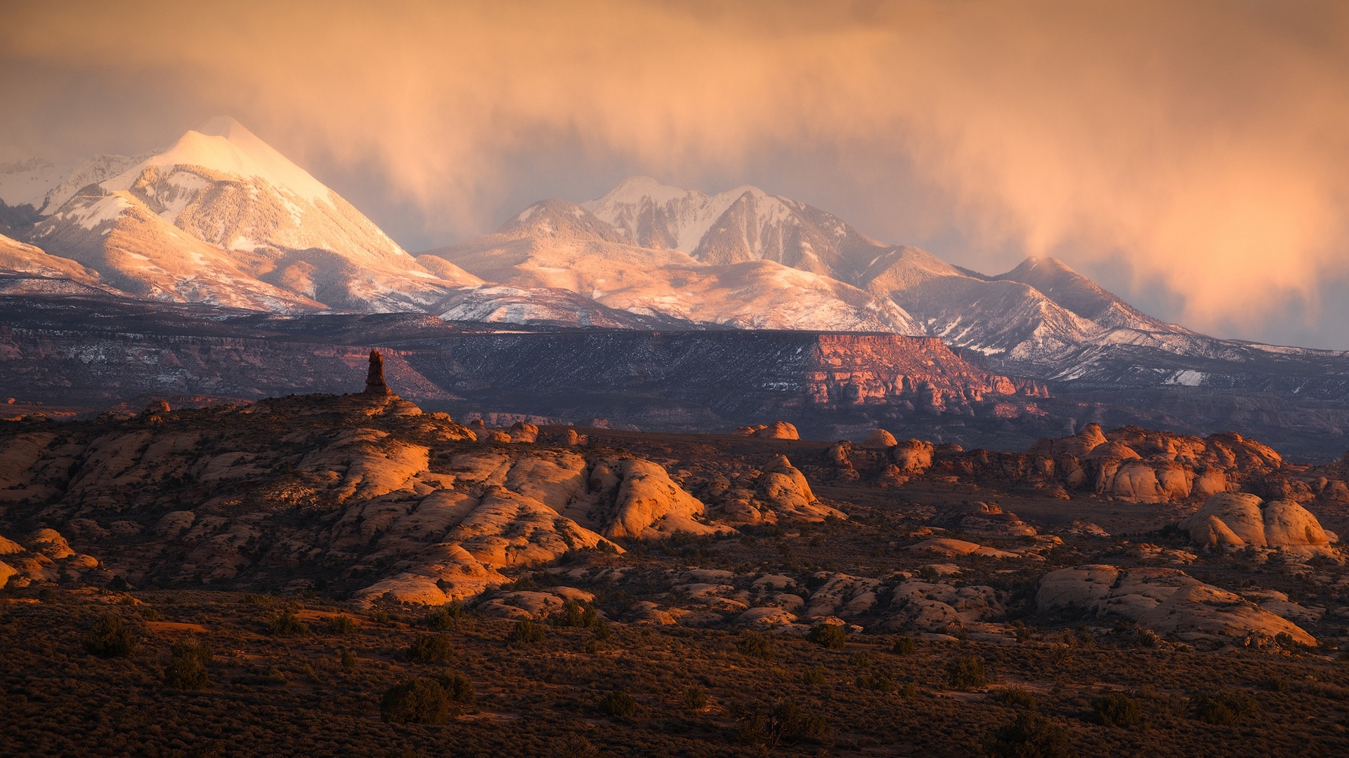 Description: A mountain range with a tower in the foreground and a cloudy sky in the background with a few clouds.