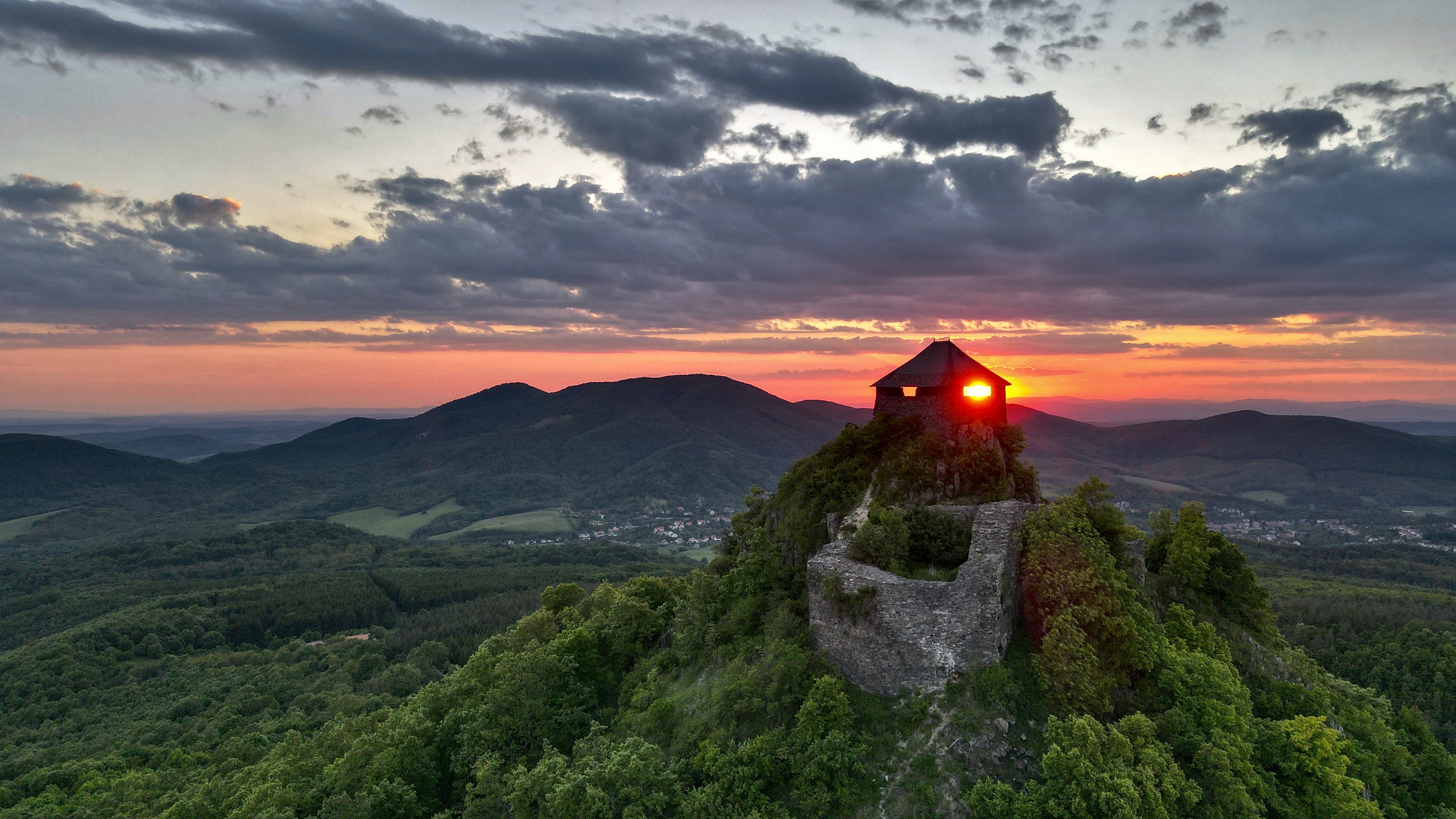 Description: A tower on top of a mountain with a red light in the middle of it's face and a sunset in the background.