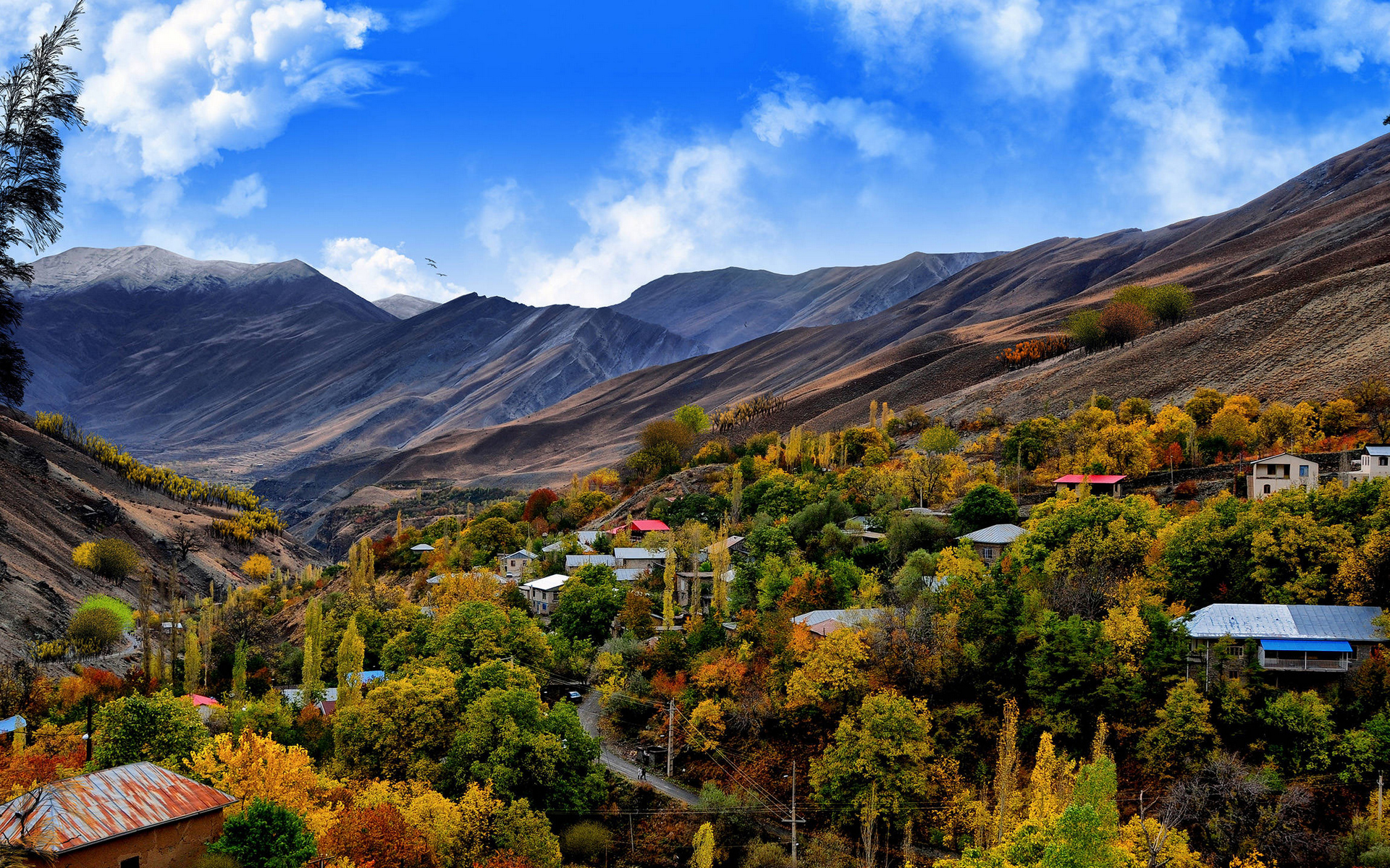 Description: A scenic view of a mountain town surrounded by trees and mountains in autumn time with a blue sky with clouds.