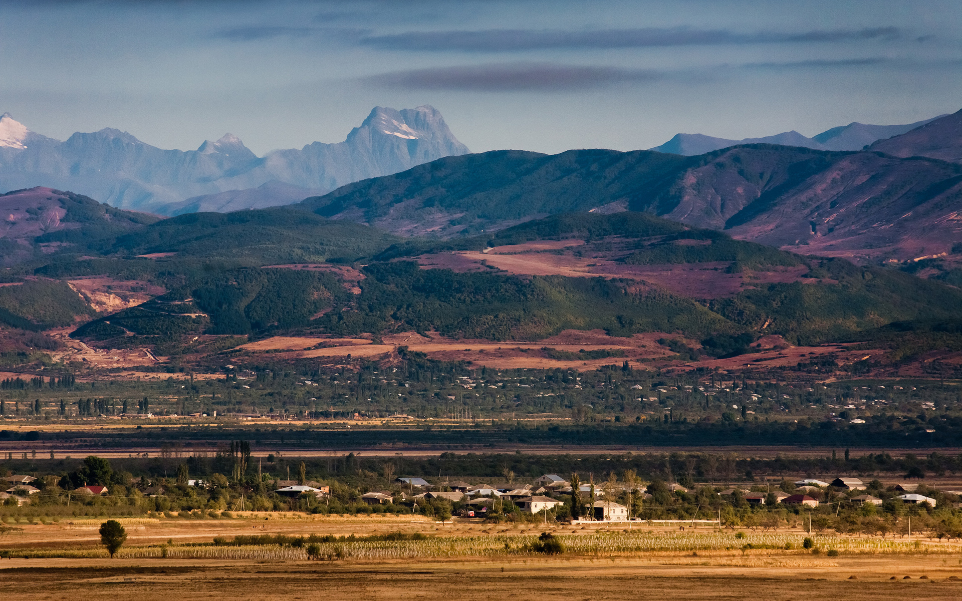 Description: A view of a mountain range with a town in the foreground and a town in the distance with a few trees in the foreground.