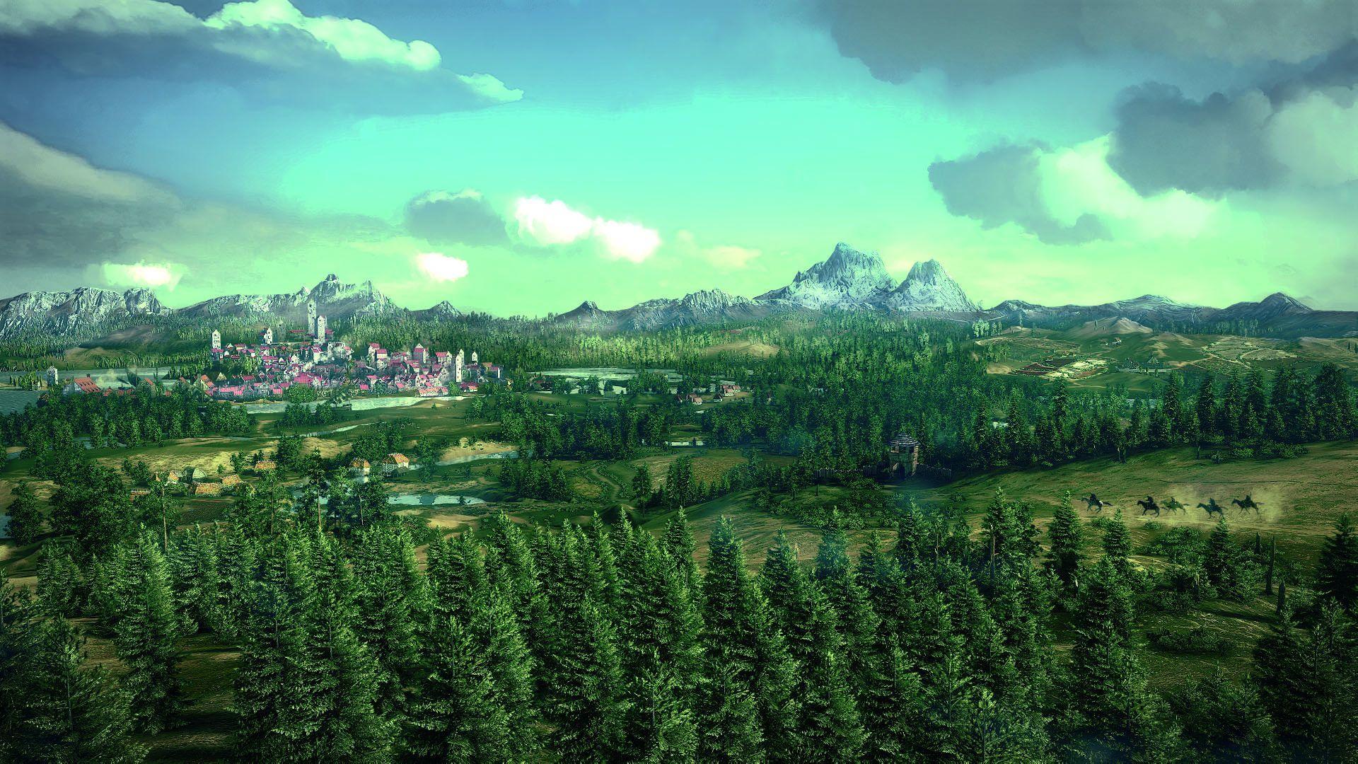Description: A painting of a mountain town surrounded by trees and mountains with a cloudy sky above it and a river running through the center.