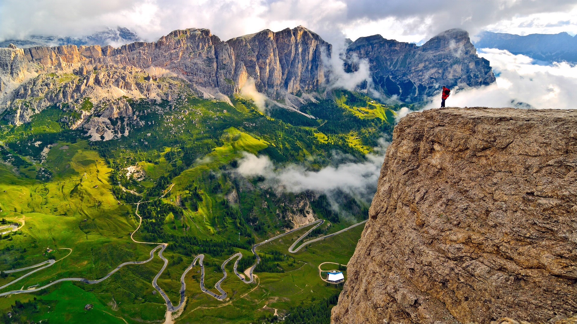 Description: A person standing on top of a mountain looking down at a valley below and a valley below the mountain.