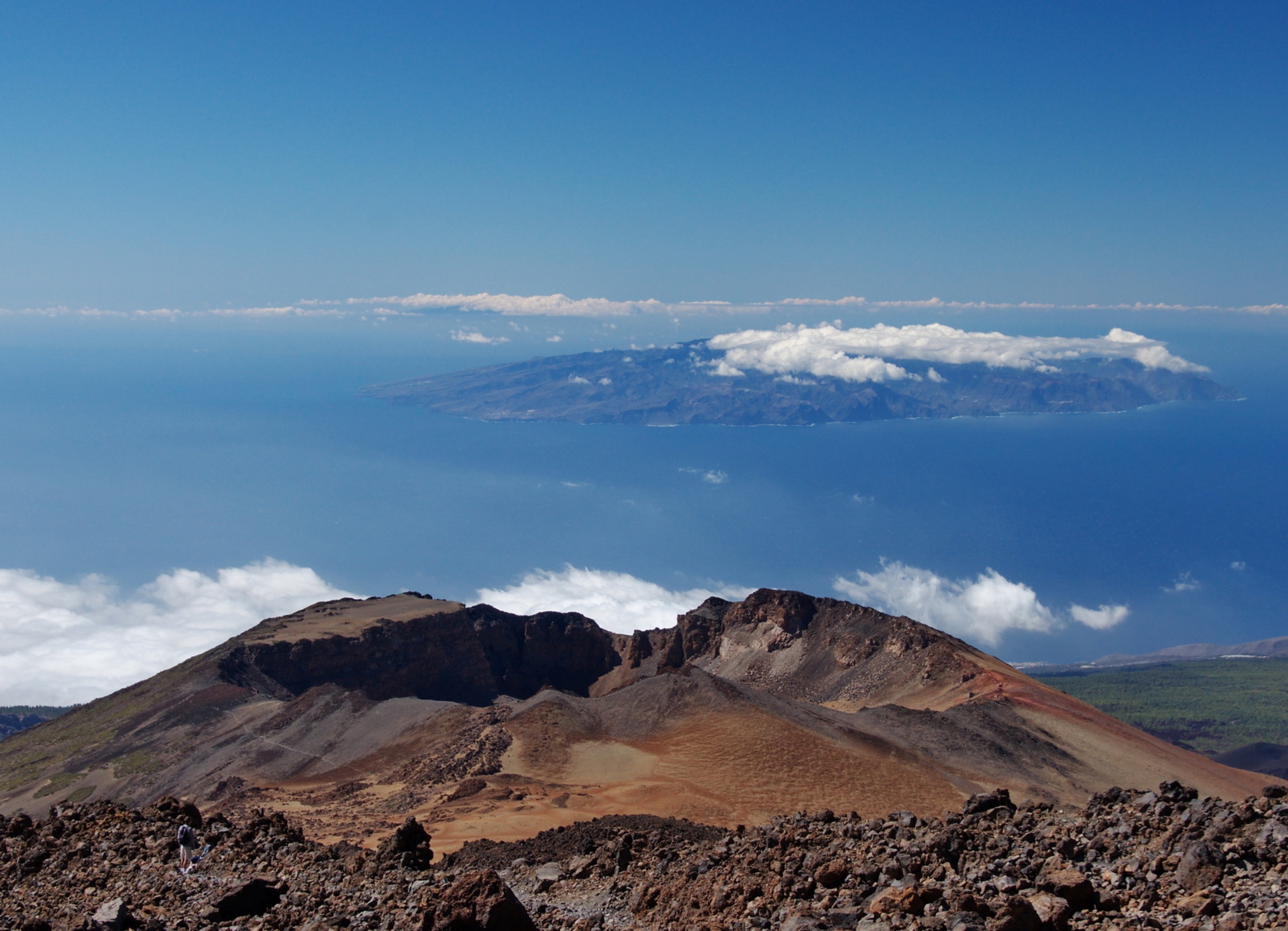 Description: A mountain with a large body of water in the distance and clouds in the sky above it.