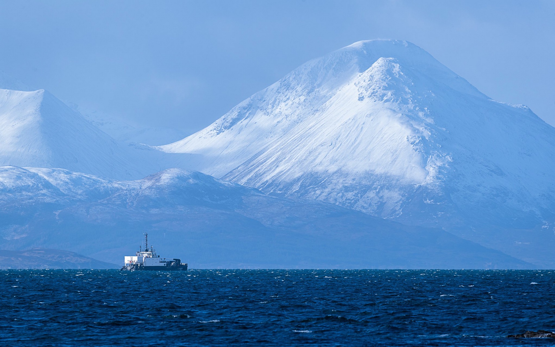 Description: A boat is in the water near a mountain range with snow on it's top and a boat in the water below.