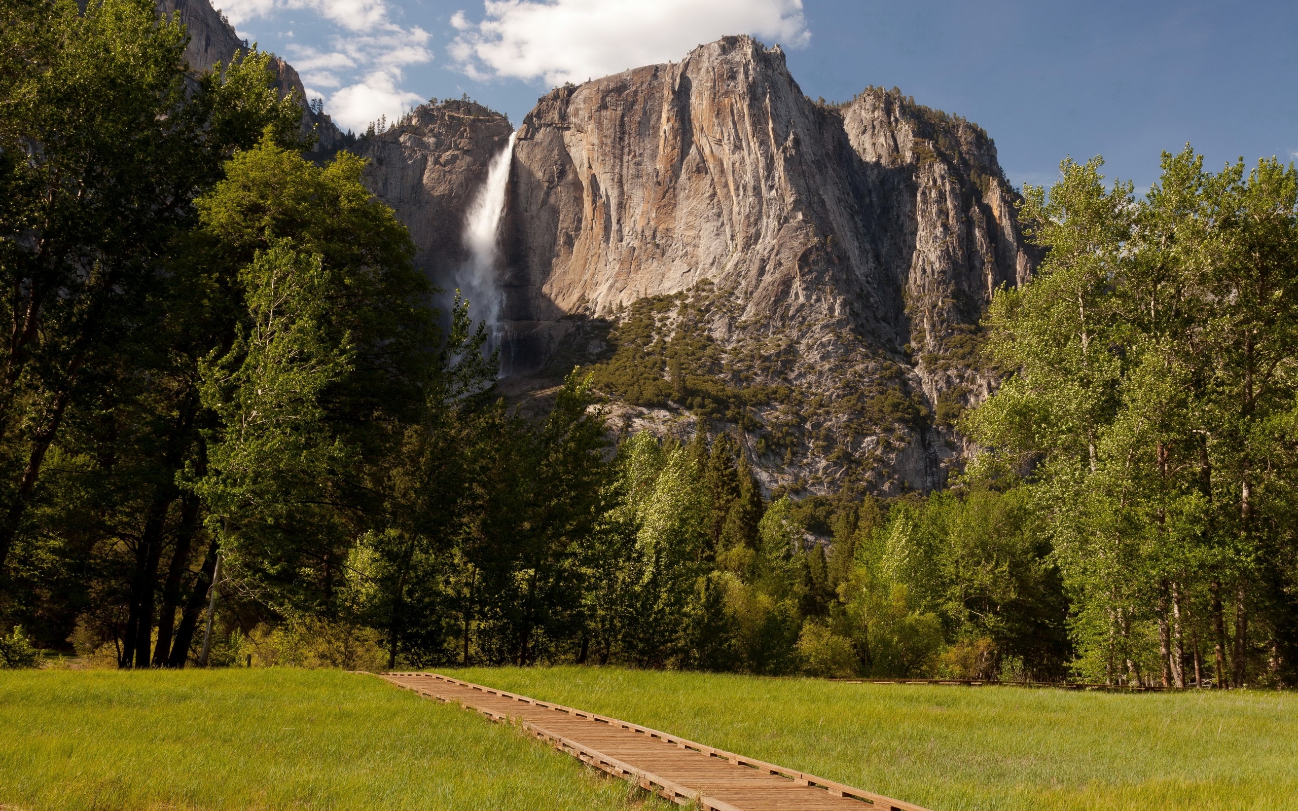 Description: A path leading to a waterfall in the mountains with trees around it and a cloudy sky above it.