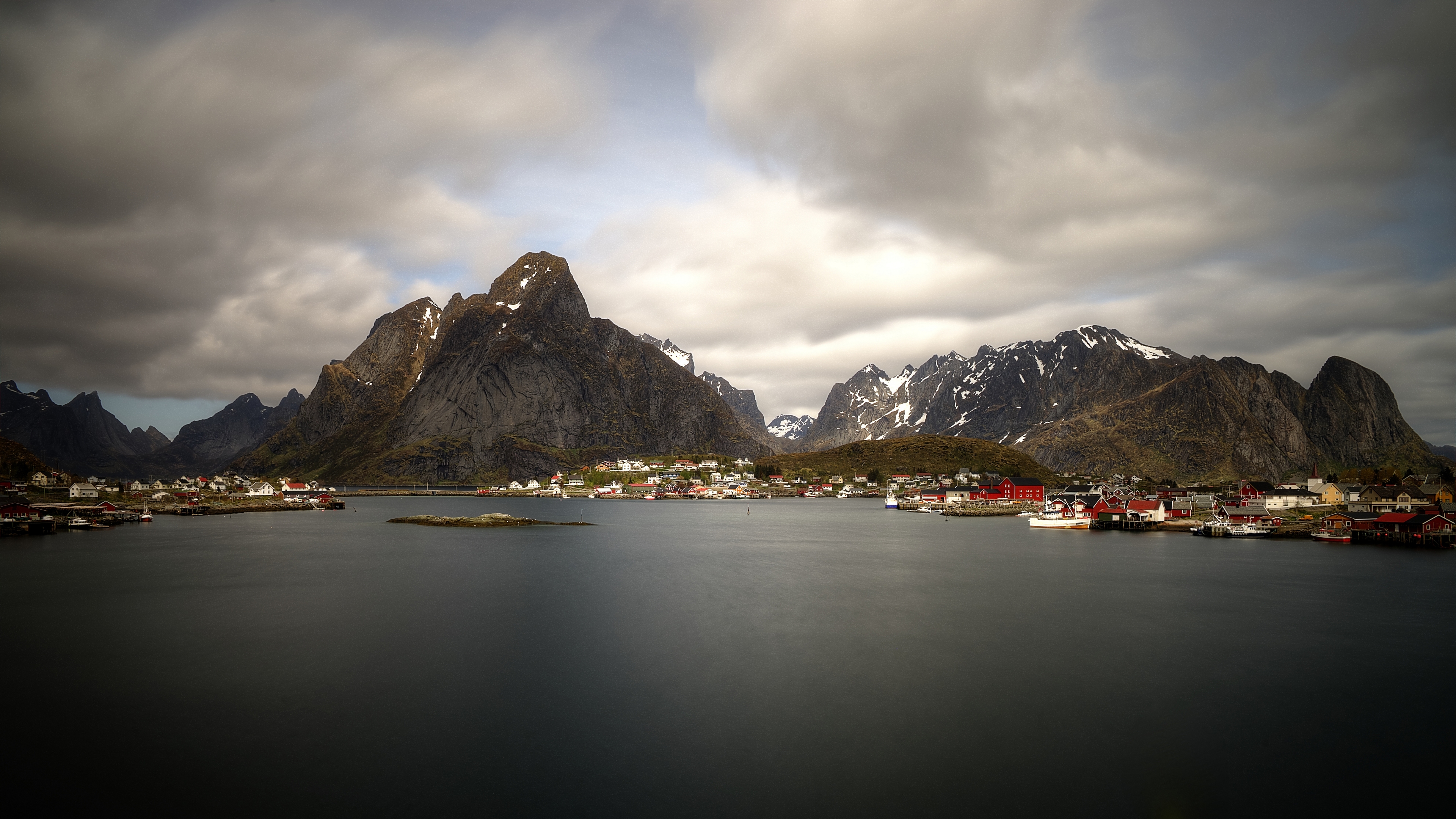 Description: A large body of water surrounded by mountains and houses on it's sides and a cloudy sky above.