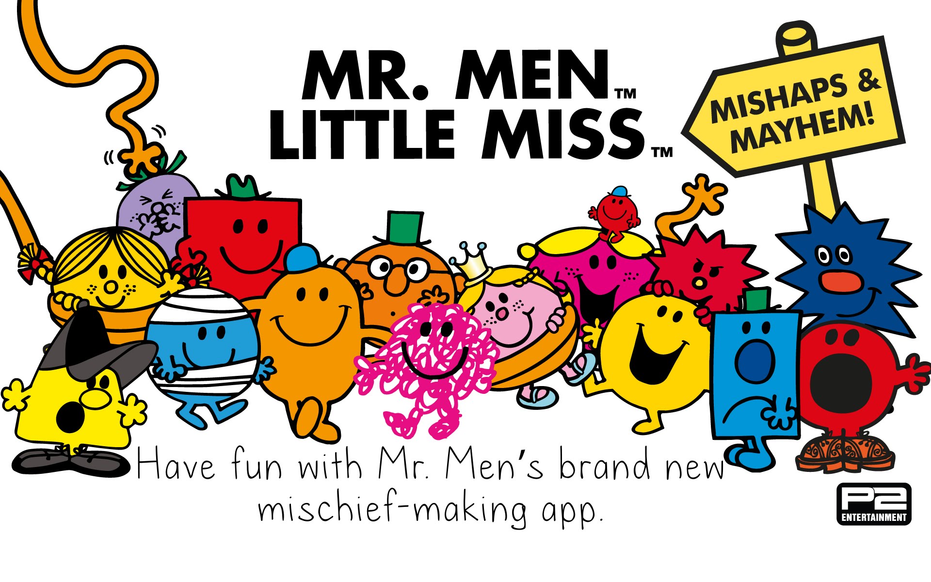 Description: A group of cartoon characters with a sign in the background that says mr men little miss and maybe have fun with mr men's brand new mische - making.