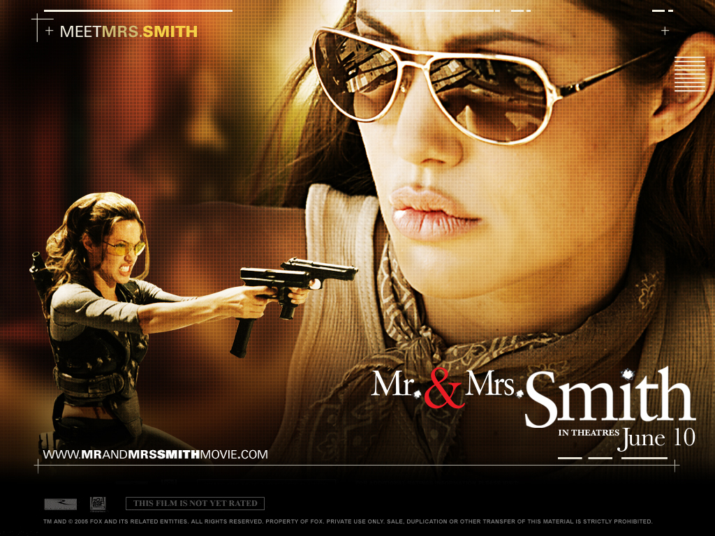 Description: A woman with a gun and sunglasses on a poster for a movie called mr and mrs smith.