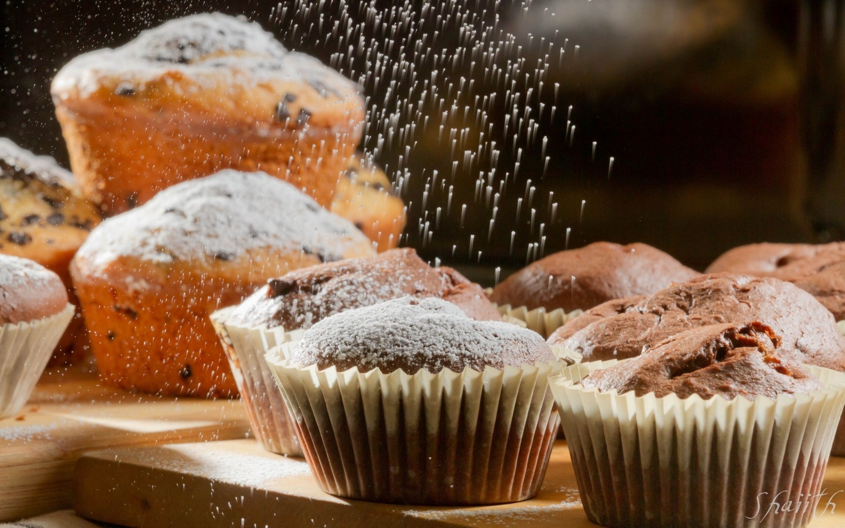 Description: A bunch of muffins that are on a table with powdered sugar on them and sprinkled with chocolate.
