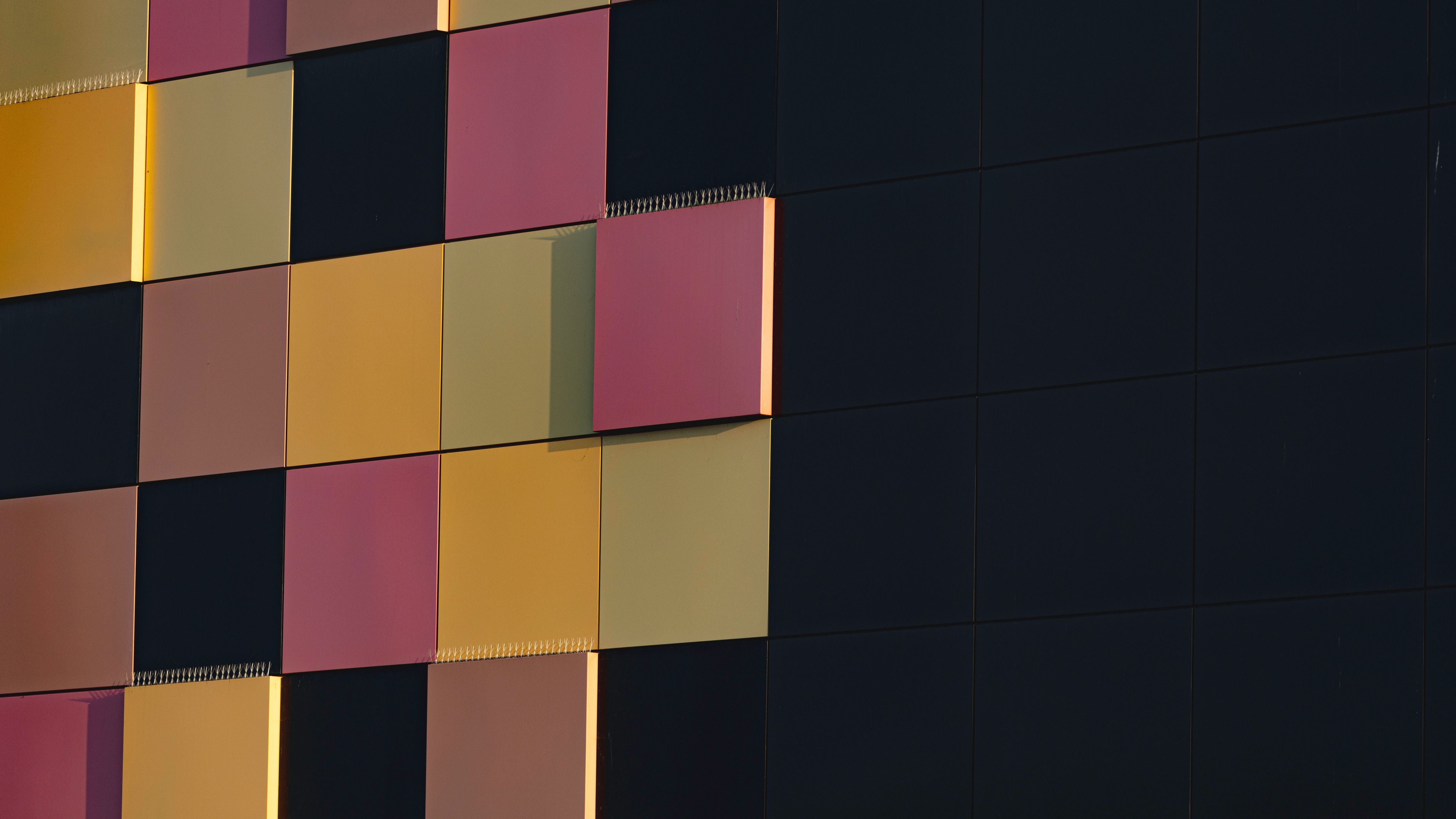 Description: A building with a multicolored facade and a clock on the side of it's face and a clock on the side of the building.