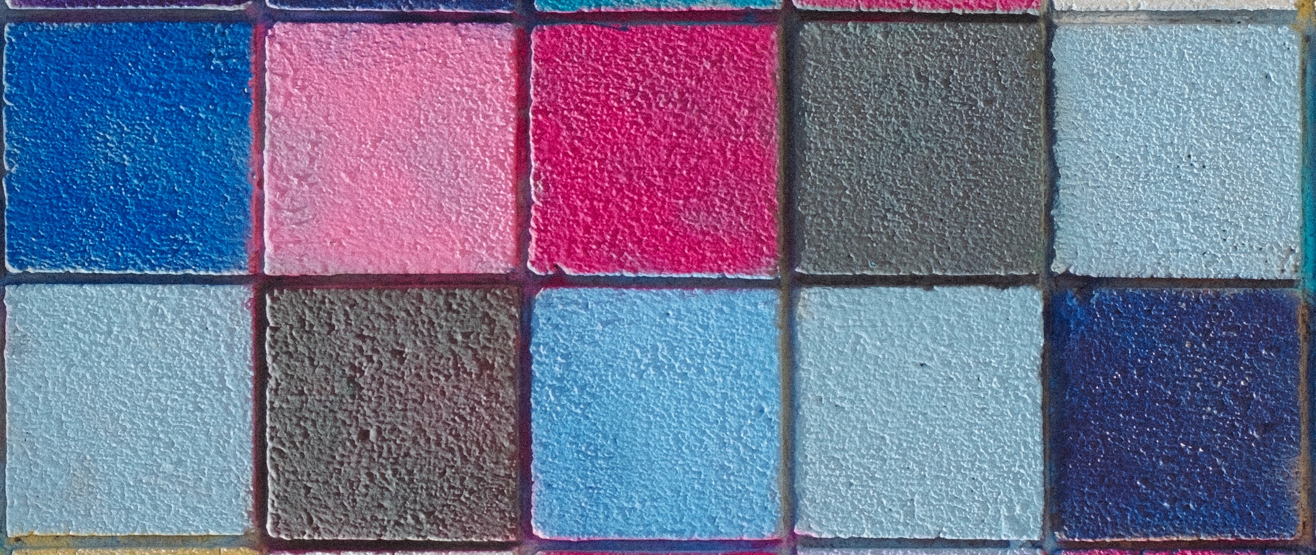 Description: A multicolored swat of paint on a wall with a black background and a white border with a red.