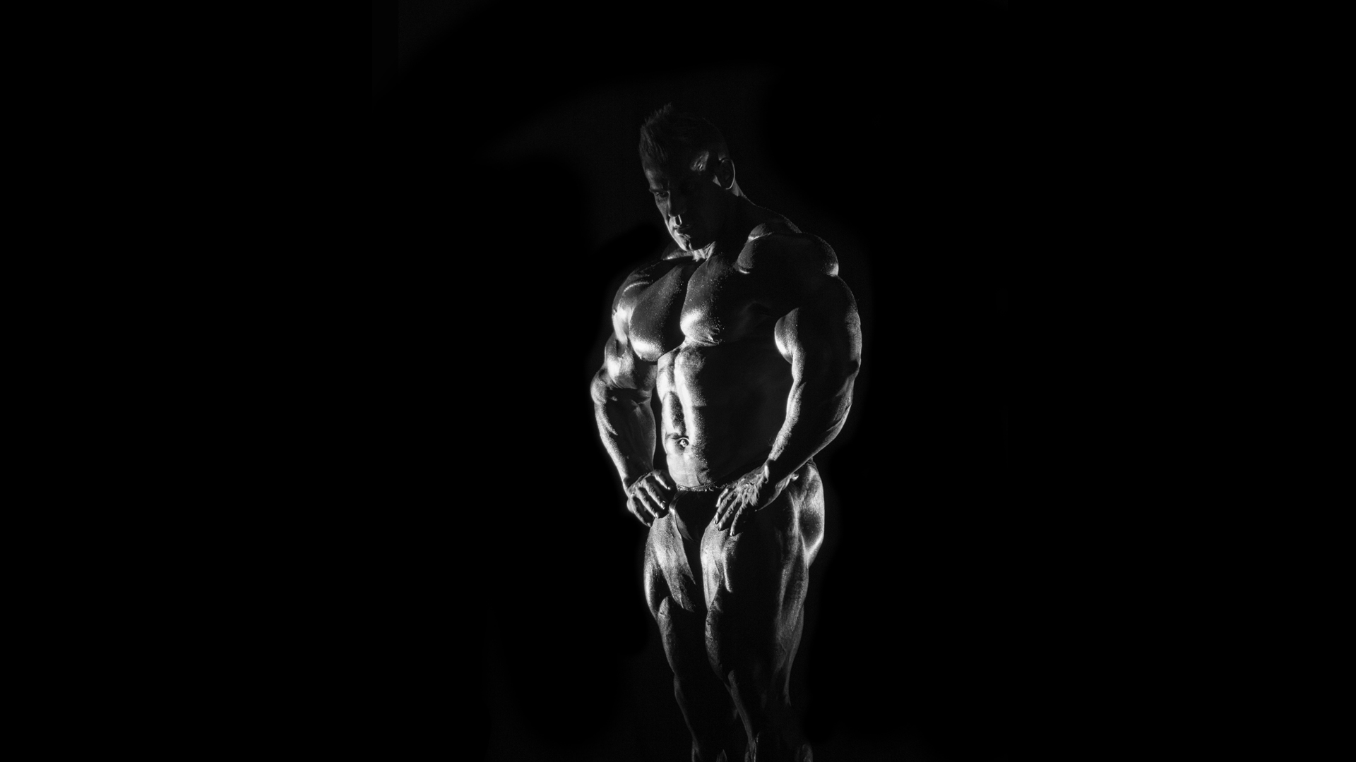 Description: A man standing in the dark with his shirt off and his hands on his hips and his shirt off.