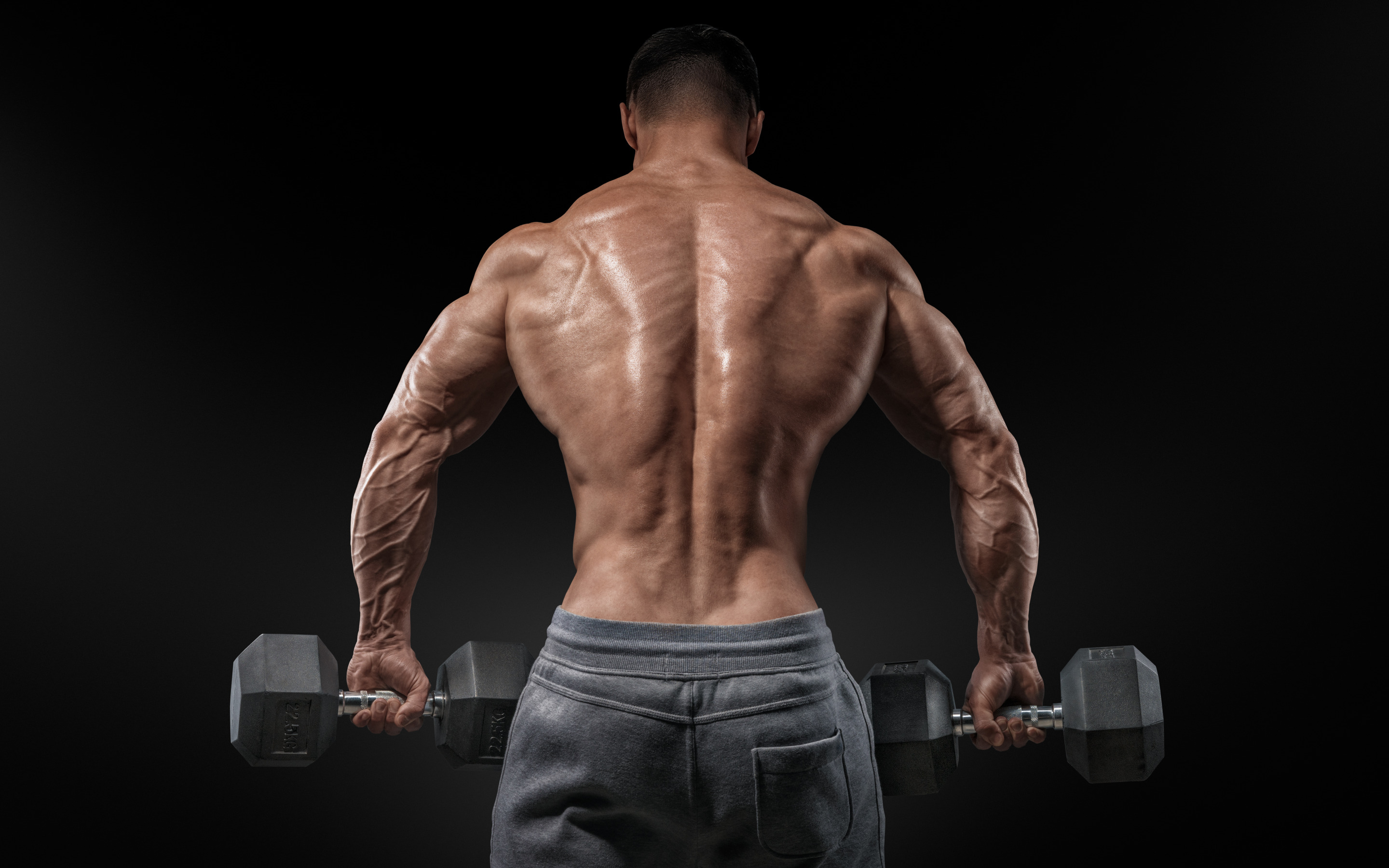 Description: A man with a back view of his body and a dumbbell in his hands.